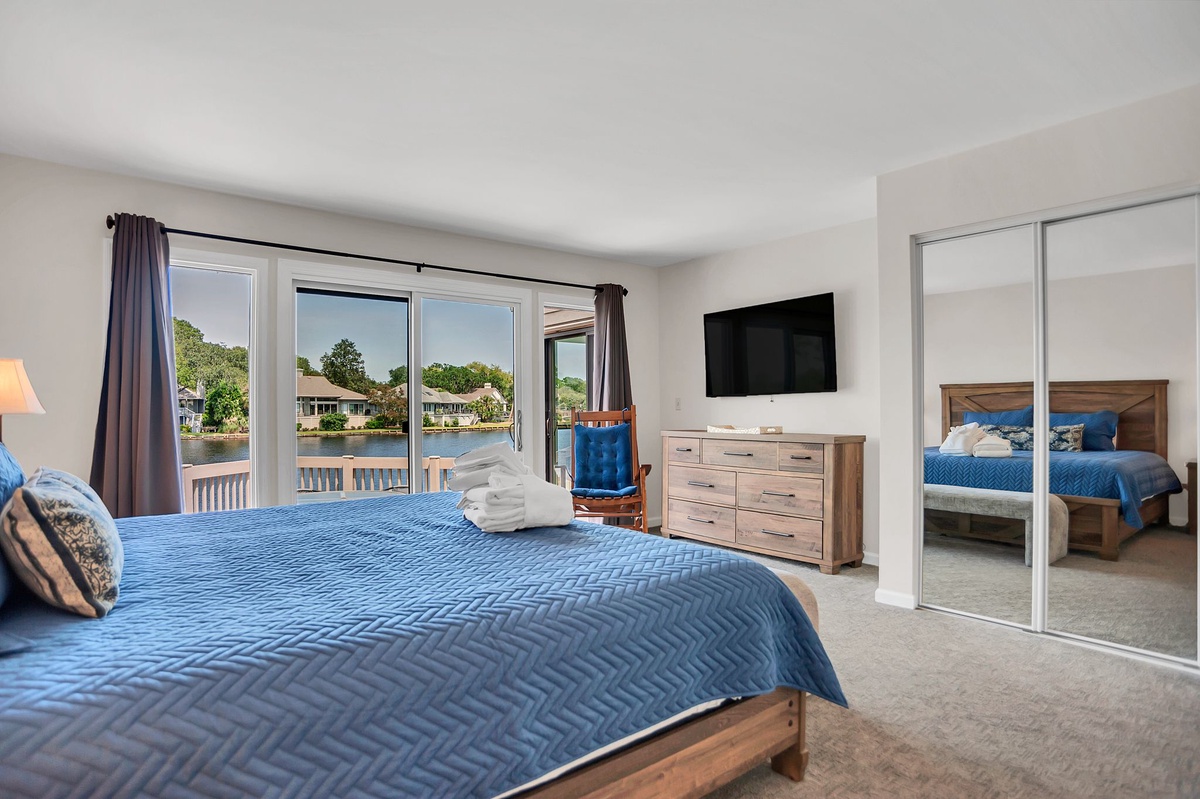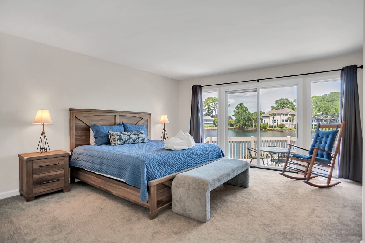 Opposite the kitchen, the conversation area beckons with plentiful seating including a plush sectional sofa facing a large flat-screen TV as well as panoramic views of the serene waters of a nearby lagoon. A door to one side lets you embrace the natural scenery on a cozy deck with al fresco dining for four and steps taking you to the water’s edge.