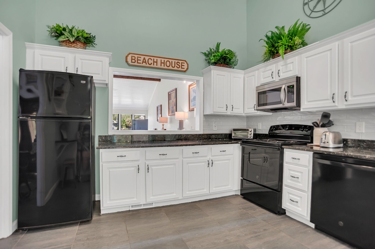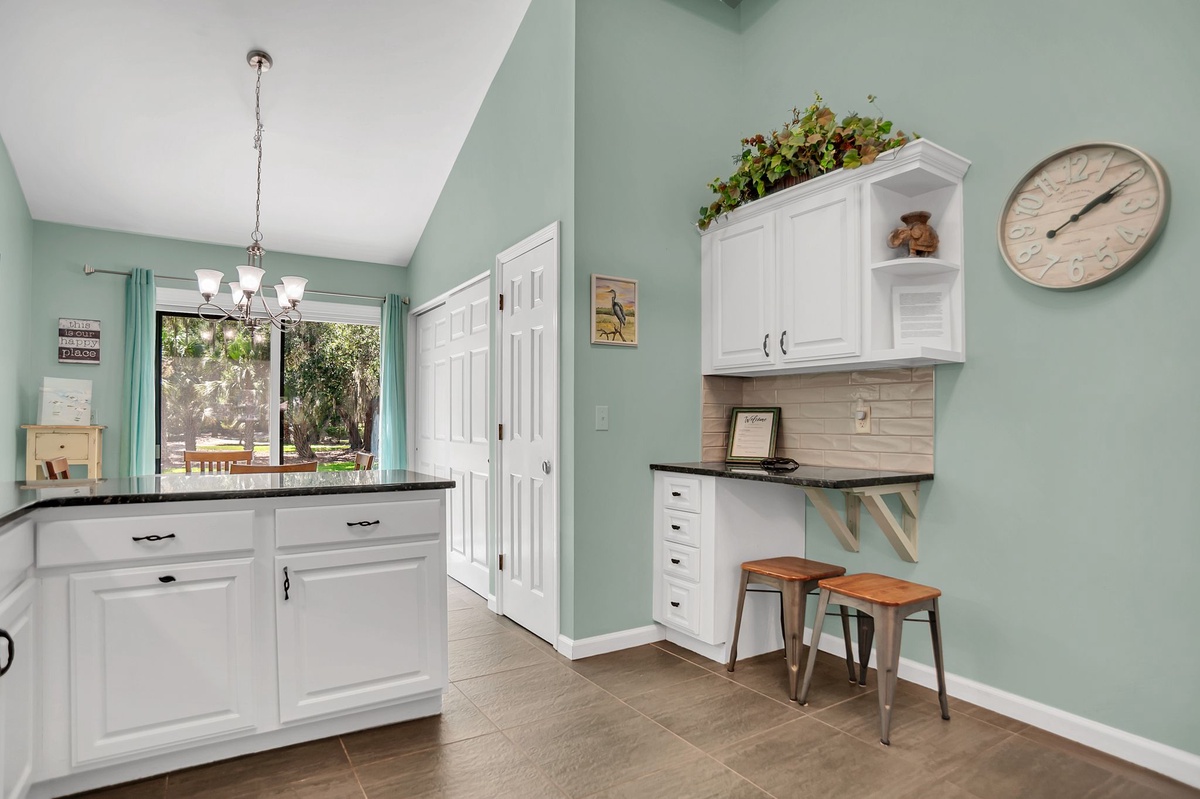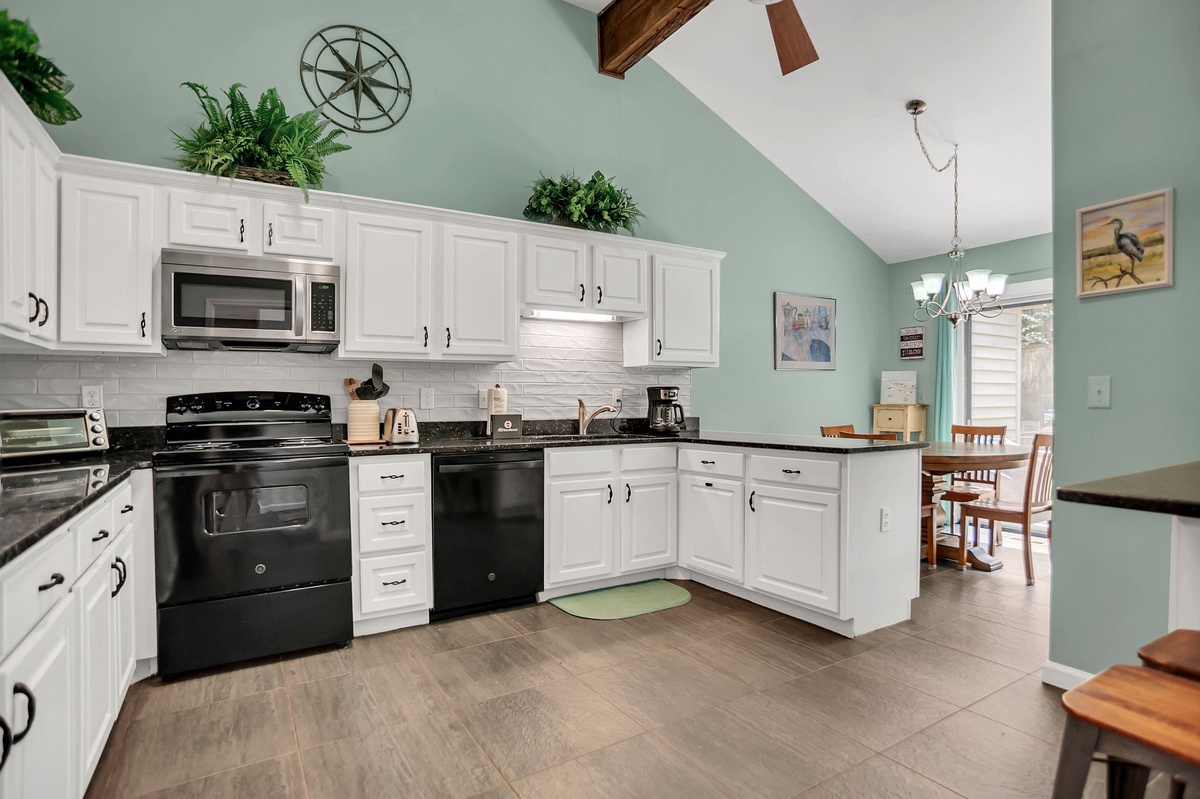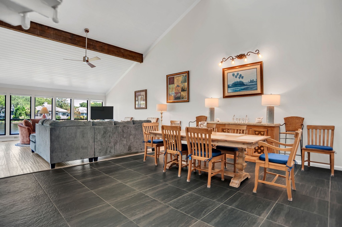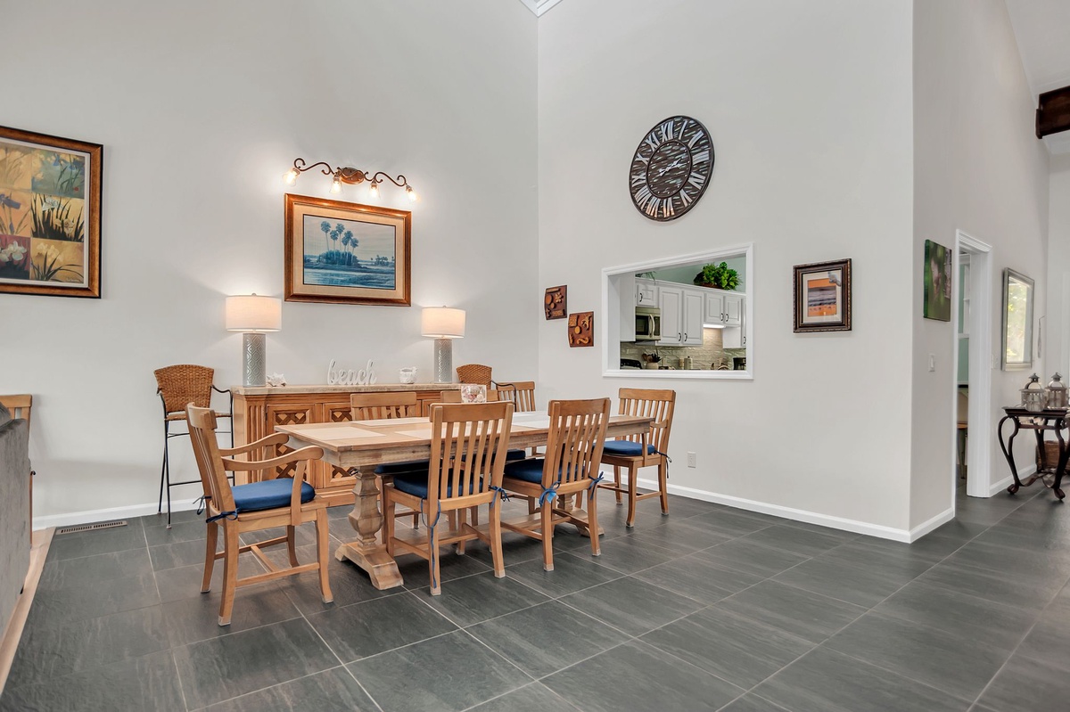 The open floor plan allows for plentiful space for the whole group to get together, with a dining room and conversation area sharing an airy atmosphere provided by vaulted ceilings and skylights. Seating for eight is available around a wide kitchen table, convenient to the expansive kitchen. Accessible through a pass-through with bar seating for two, the kitchen offers all the conveniences of home and amid spacious luxury. A nearby breakfast nook offers seating for four beside sliders leading to a private patio and adjacent to a tucked-away washer and dryer.