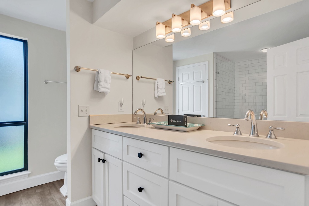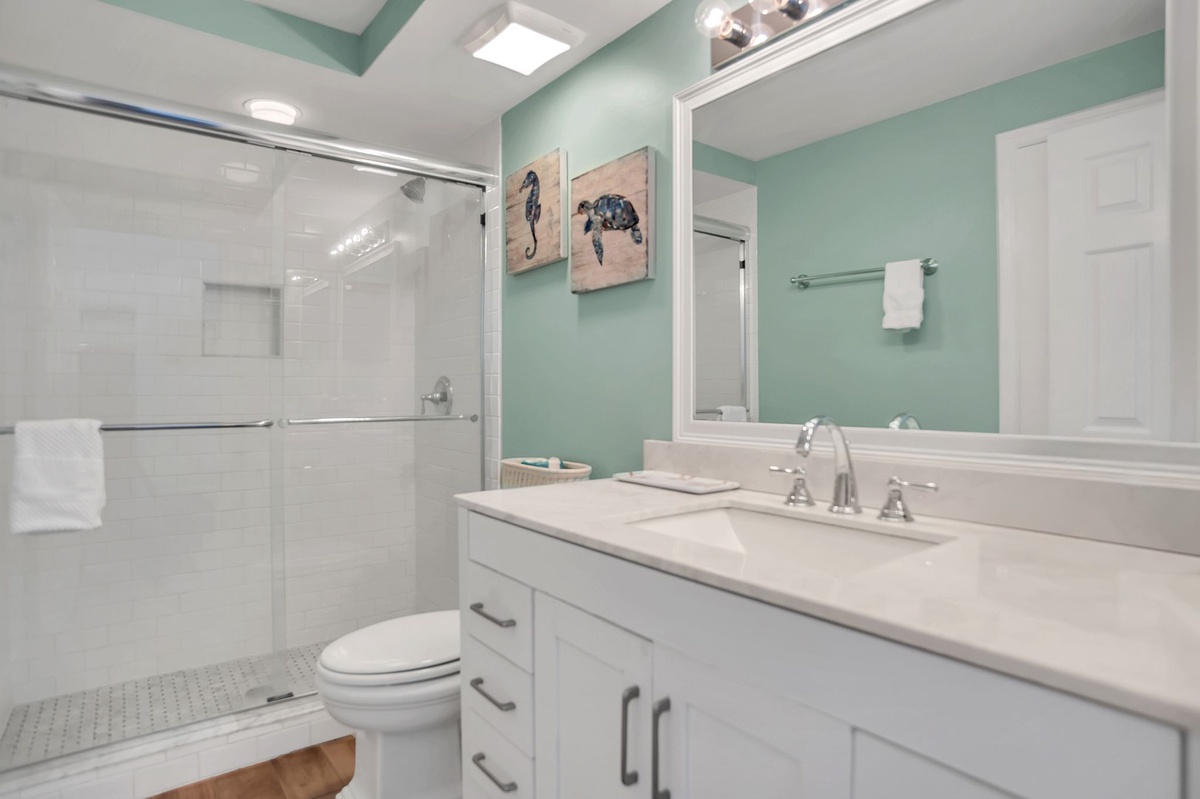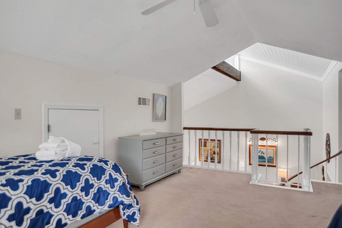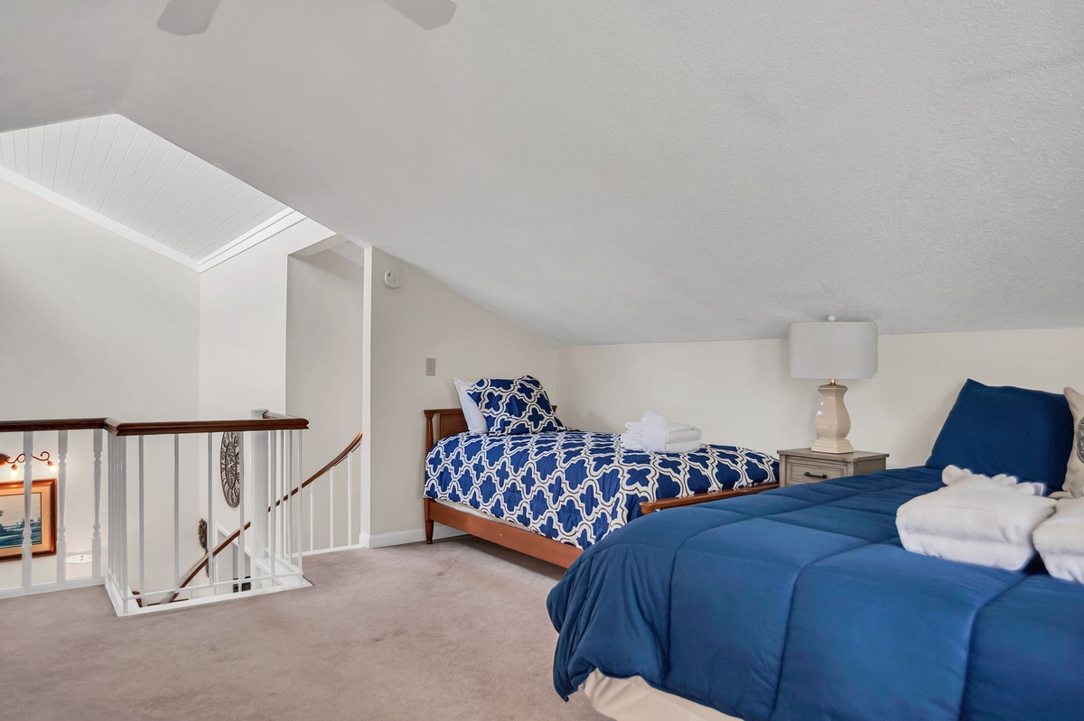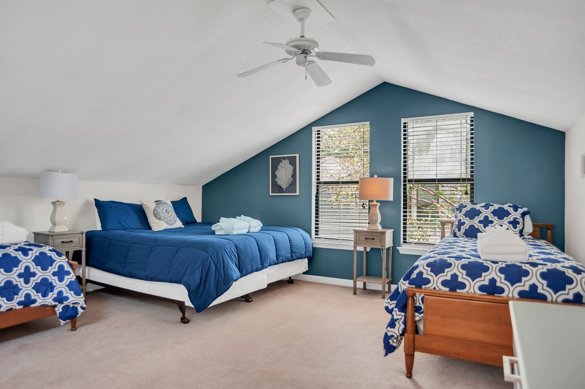 This aura of tranquility and coastal chic carries into each of the villa’s two bedrooms and loft. One, on the ground floor with its king sized bed, windows on two walls and wall-mounted flat-screen TV. Another, just up a whimsical floating spiral staircase where a roomy LOFT area sees a king and two twin sized beds set beneath vaulted ceilings with ceiling fan and flat-screen TV.