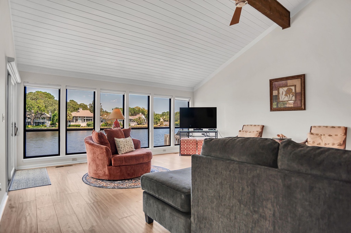 Featuring soaring ceilings, lush natural light and a splendidly tranquil lagoon view, this two-bedroom with loft vacation villa is the perfect getaway for those looking to unwind amid the beauty of Sea Pines.