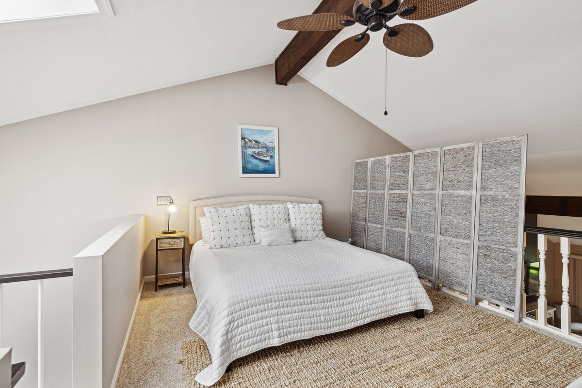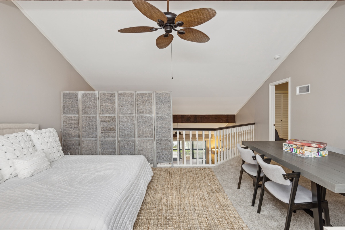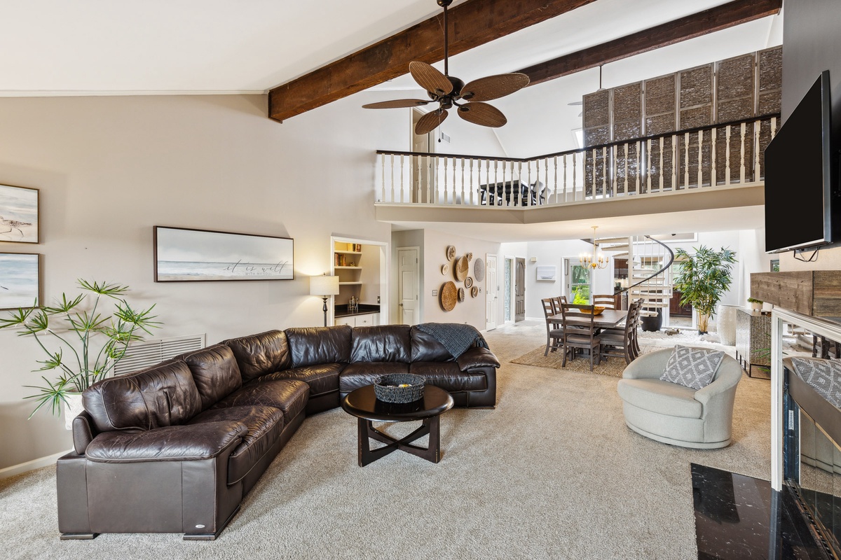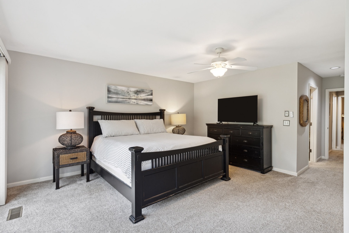 Able to host even the largest of vacation groups, this home’s three guest suites are joined by an open air loft above the great room with a king-size bed. The two queen suites, one on the first floor and one on the second, each offer comfort and spaciousness along with private bathrooms. The primary suite, enjoying beautiful lagoon views and private access to the rear patio, indulges with a king size bed, ceiling fan, flat-screen TV and massive ensuite bath offering a walk-in shower and oversized garden tub.
