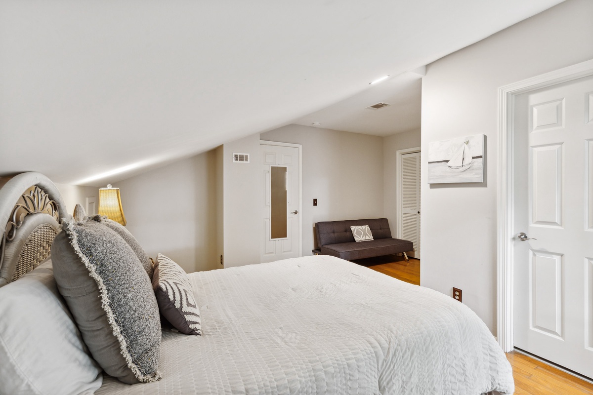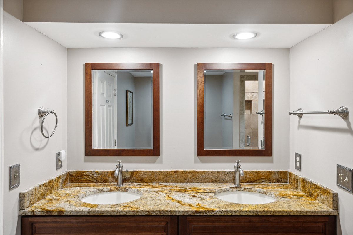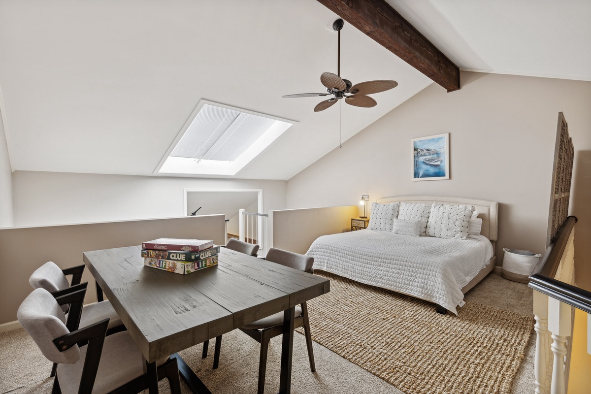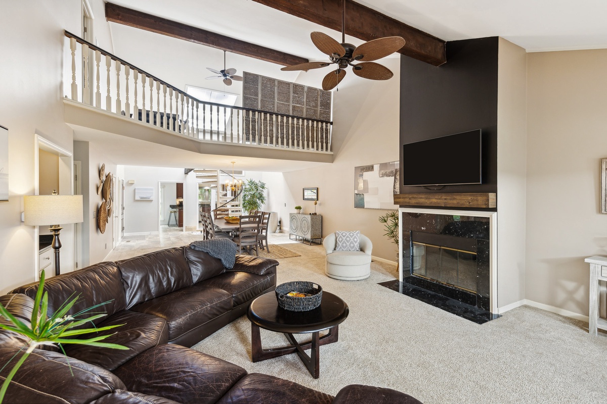 Able to host even the largest of vacation groups, this home’s three guest suites are joined by an open air loft above the great room with a king-size bed. The two queen suites, one on the first floor and one on the second, each offer comfort and spaciousness along with private bathrooms. The primary suite, enjoying beautiful lagoon views and private access to the rear patio, indulges with a king size bed, ceiling fan, flat-screen TV and massive ensuite bath offering a walk-in shower and oversized garden tub.
