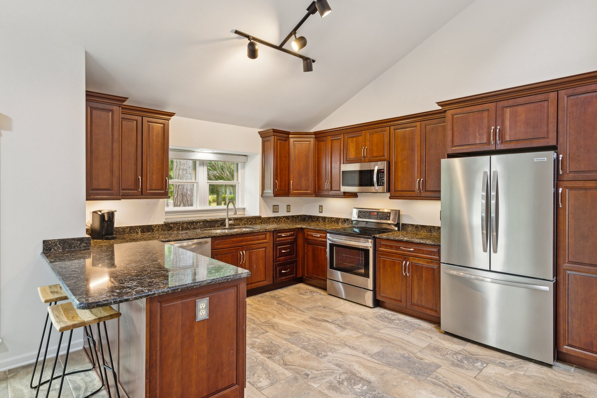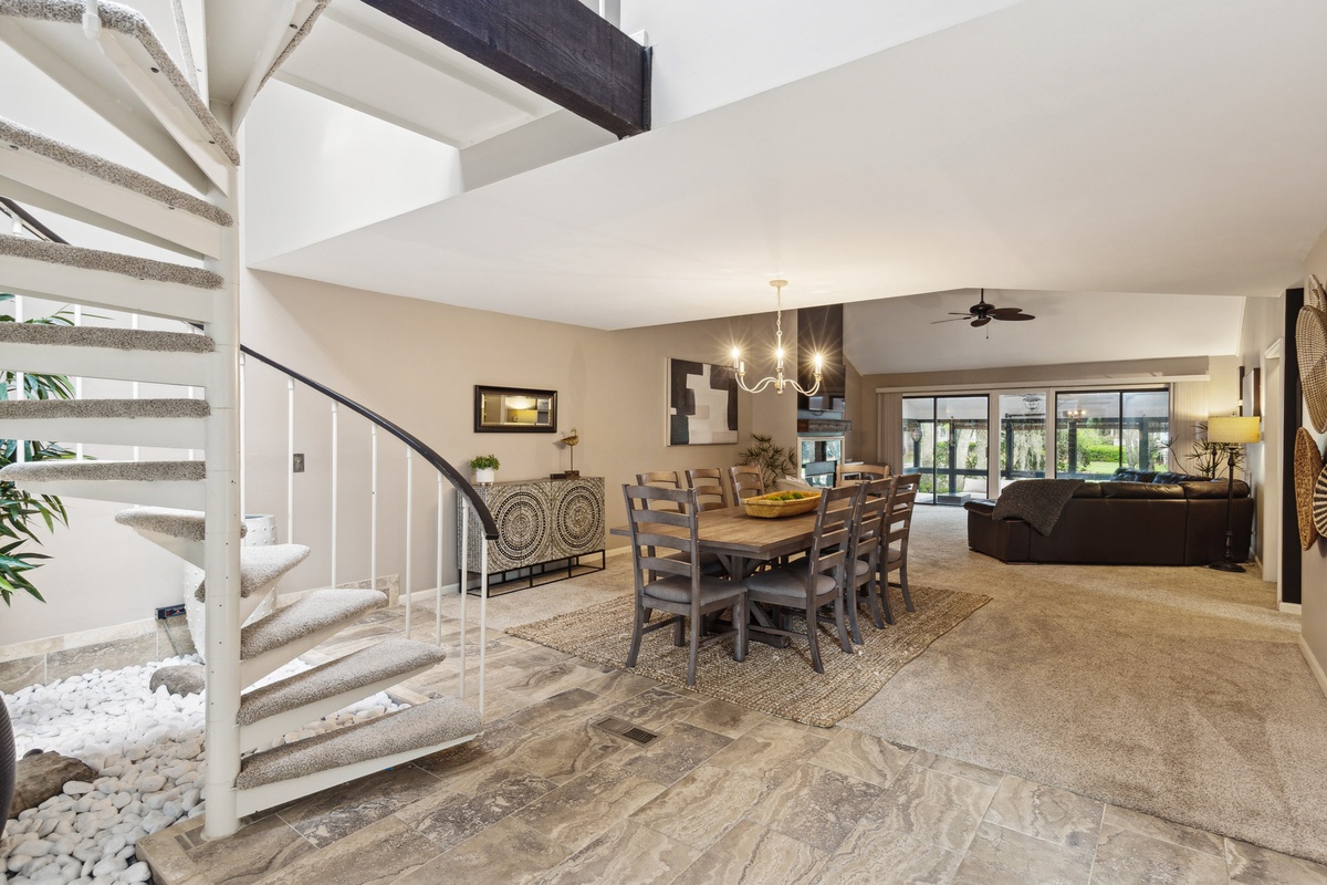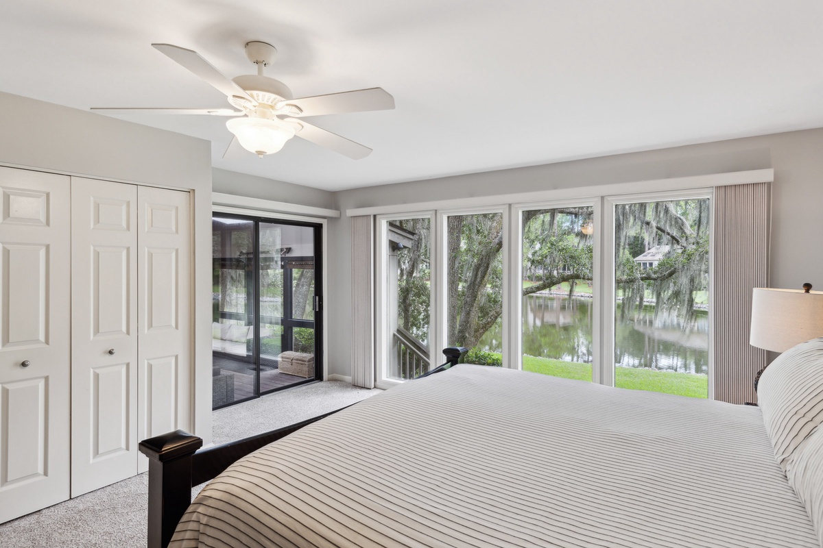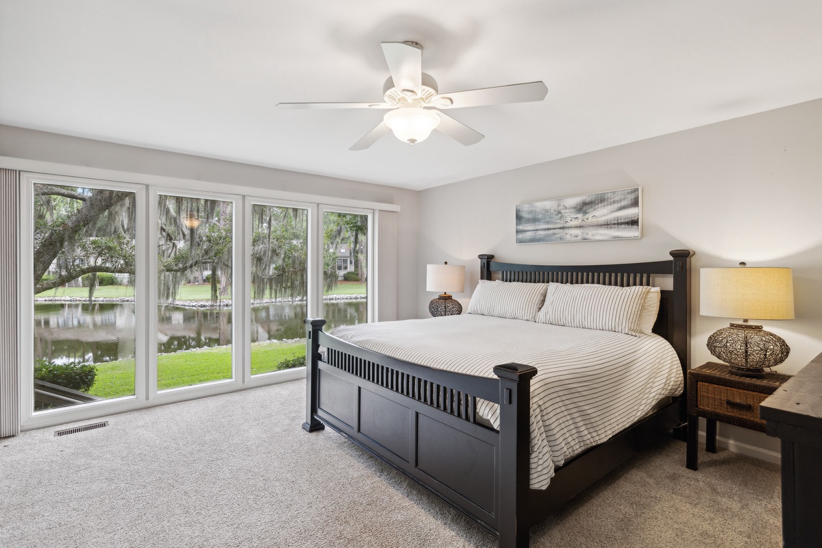 Set at the edge of a sparkling lagoon, this breathtakingly breezy Calibogue Club villa delights with a sense of spaciousness and sophisticated comfort. The sunlit splendor of a central atrium greets you as you enter, with a spiral staircase rising from an alcove of natural stone. Open to this space through walls of windows, the expansive kitchen boasts granite counter and updated appliances, with dine-in seating for four surrounded by a panorama of windows.