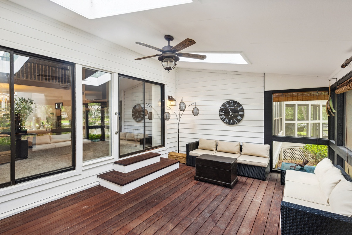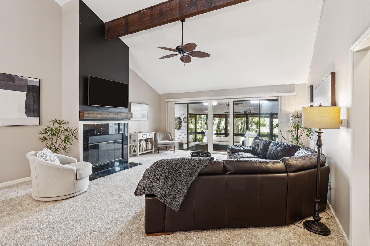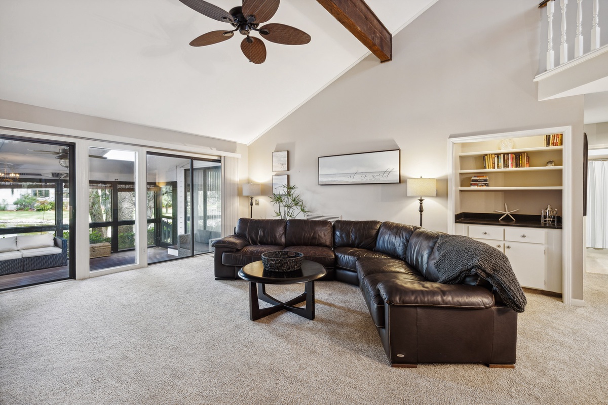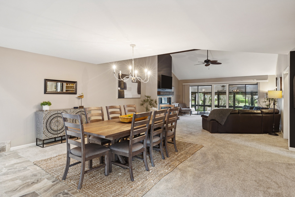 Stretching towards the rear of the home, formal dining for eight amid artistic décor transitions to the soaring great room. Beneath vaulted ceilings, this space opens before you with decorative fireplace and flat-screen TV set on a bold accent wall. Facing this, a wide sectional sofa and convenient bar area let you indulge in pure vacation relaxation. Step through the wall of sliding glass, and you’re surrounded by screened views of the lagoon’s tranquility, with outdoor furniture for year-round comfort.