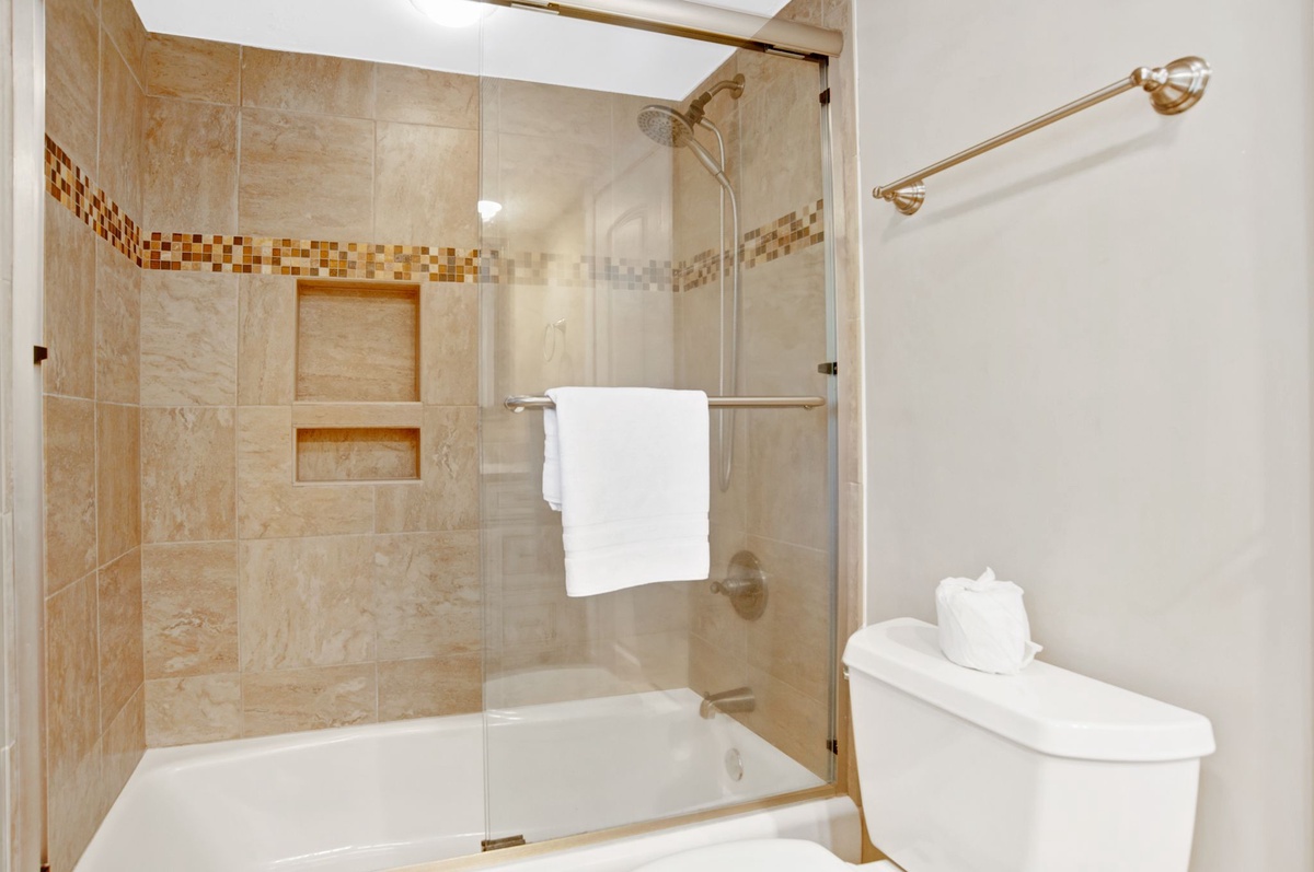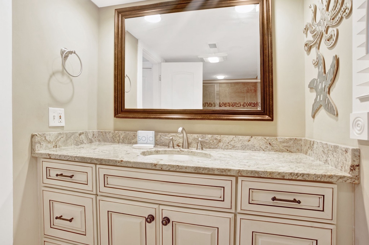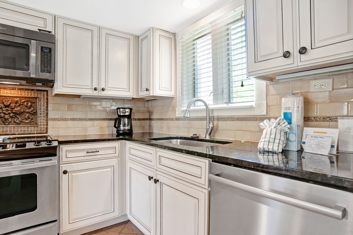 This style is on display in the kitchen, where rich speckled granite counters run below a vermilion tile backsplash and expertly distressed cabinets. The chef of the family will be thrilled to see that the kitchen has been stocked with state-of the-art stainless steel Whirlpool appliances.