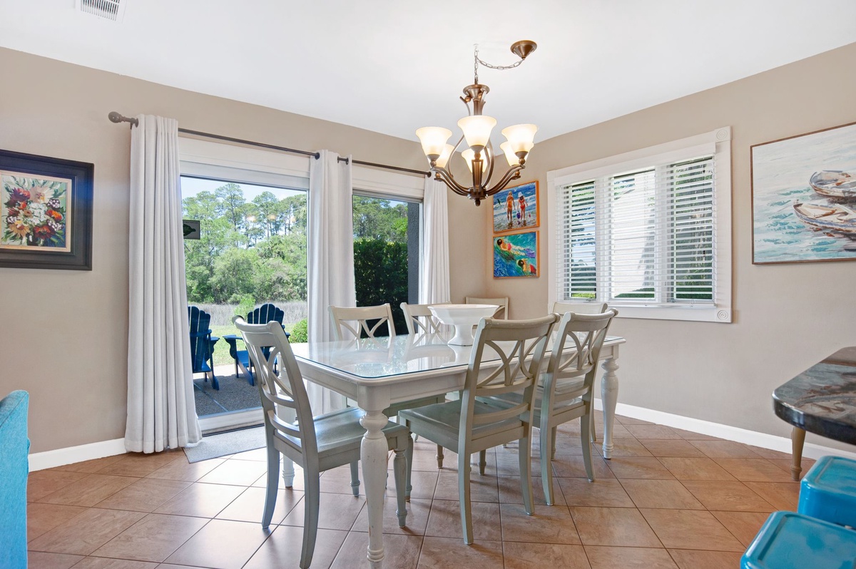 A wide granite counter extends past the kitchen, tying it into the light, airy dining room where a wide French country-inspired table with seating for eight is placed before a wall of beautiful natural light thanks to sliding glass doors.