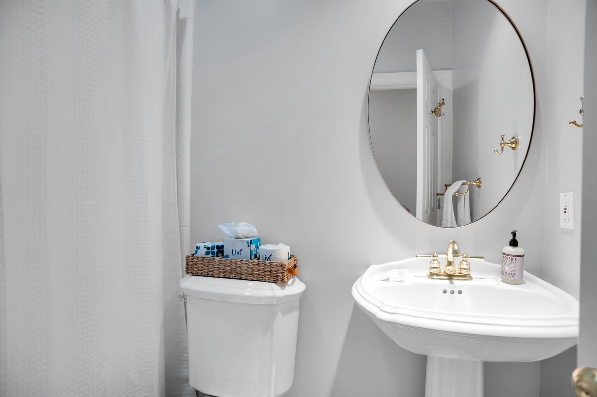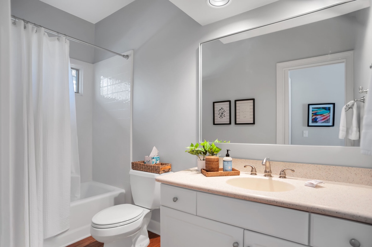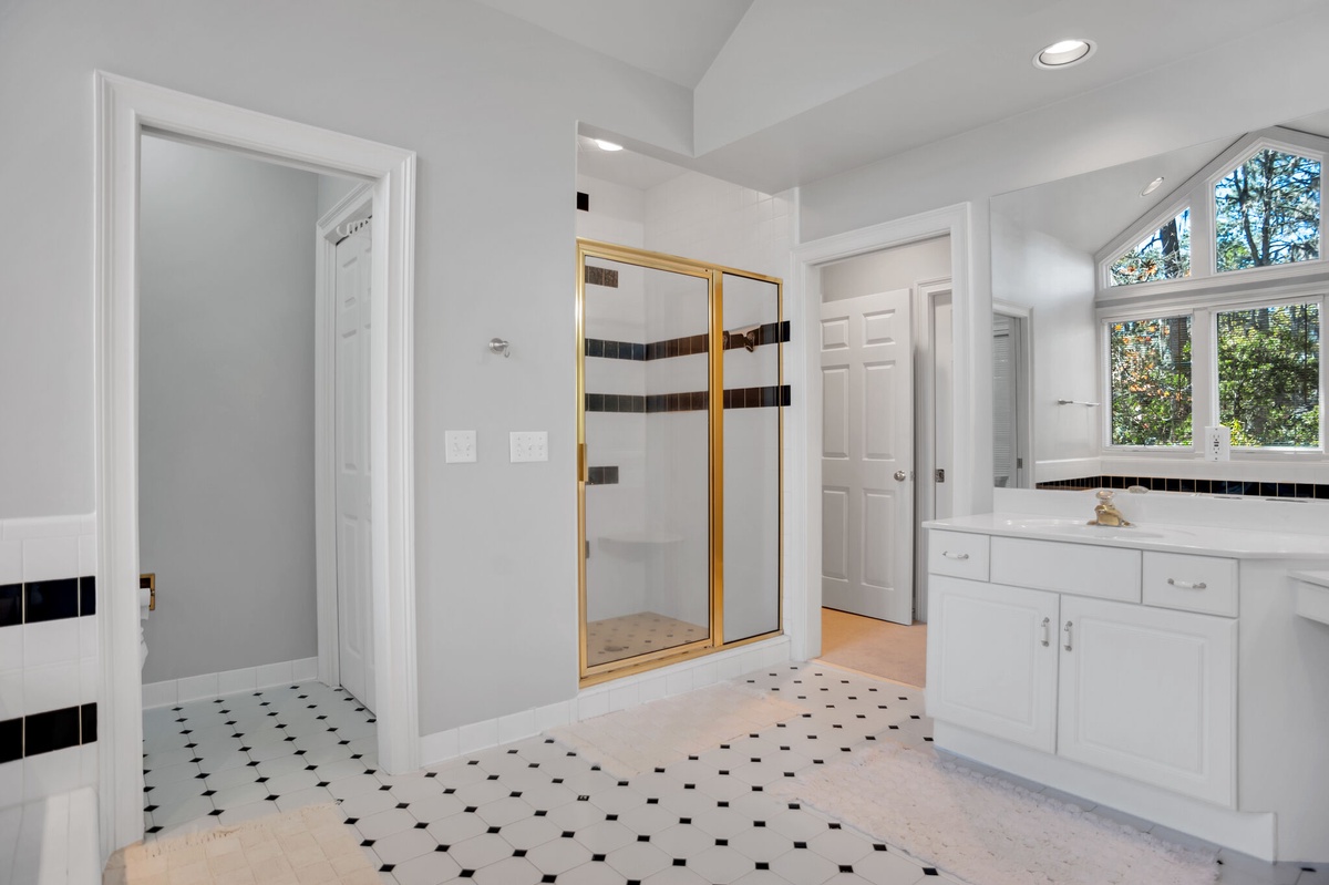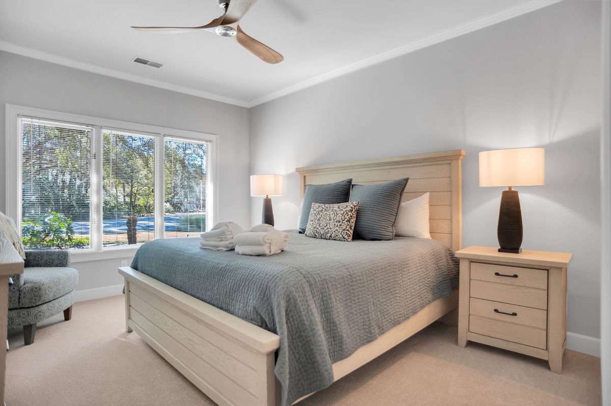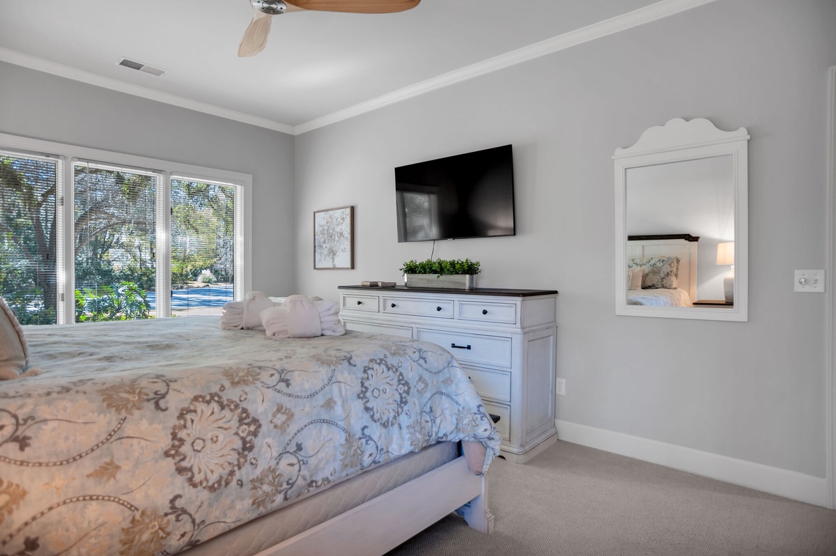 Set off the main living spaces for a serene sense of privacy, the remaining guest rooms each indulge with a sense of stylish comfort. In one, a king-size bed anchors a space defined by upscale custom trim, wide-blade ceiling fan and flat-screen TV with access to a nearby full bath with tub and shower. In the next, windows on two walls illuminate a spacious suite with king-size bed, ceiling fan, flat-screen TV and en suite bath boasting tub and shower.
