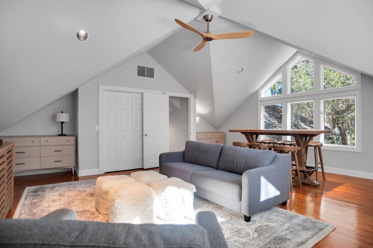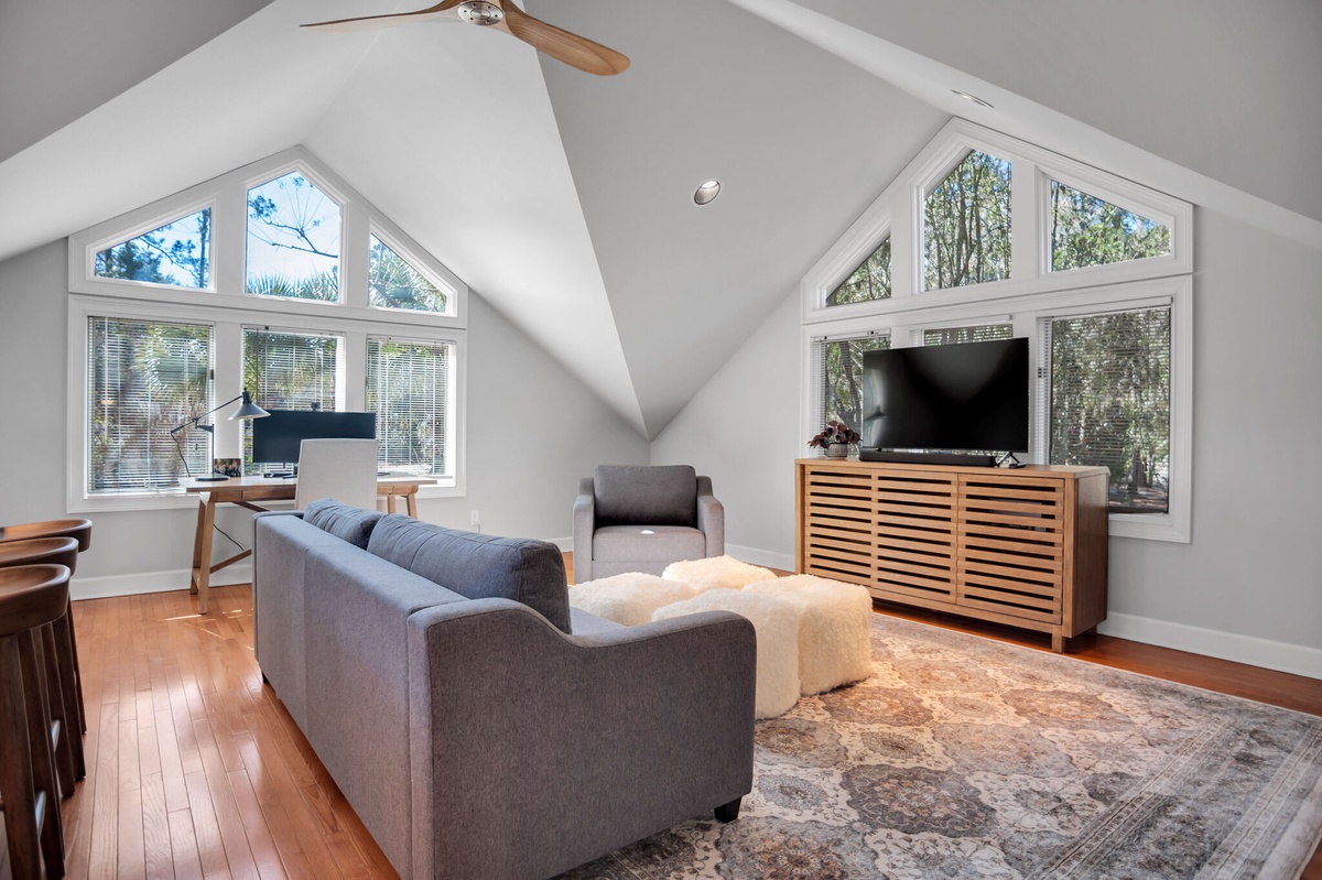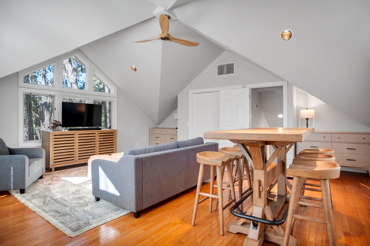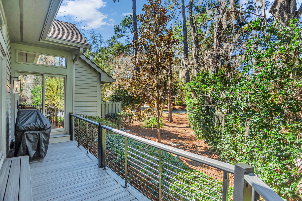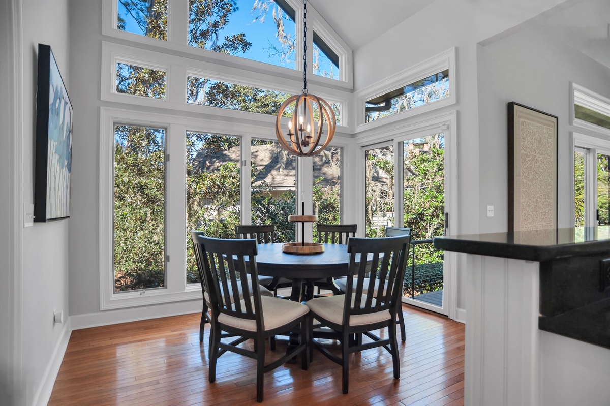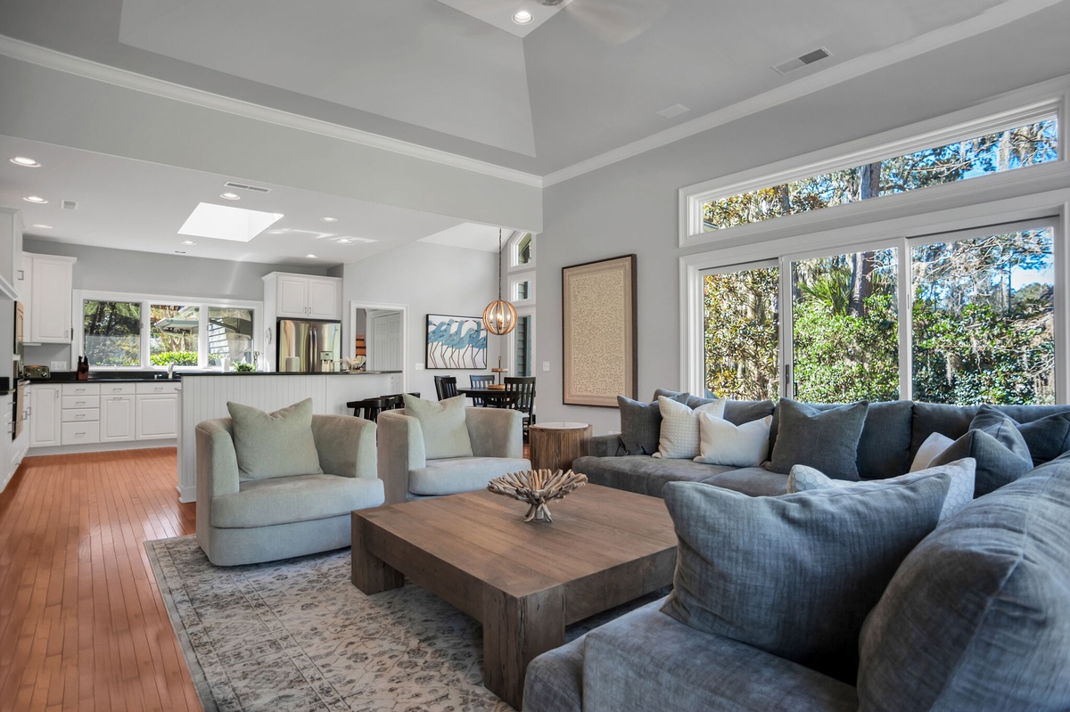 At the heart of this property is the soaring great room, whose tall half-barrel topped windows drink in the lush greenery beyond. Beneath soaring cathedral ceilings, dual sofas flank a decorative fireplace and a massive flat-screen TV. Throw open the sliding doors at the center of the wall of glass and find yourself on a wide deck immersed in the stunning natural beauty of the South Carolina Lowcountry.