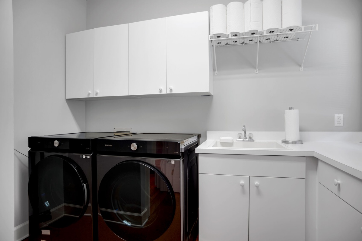 A second-story carriage house gives everyone a place to gather with its large flat-screen TV and high-topped gaming table for eight. But if you have a large group, its king-size and full-size foldouts and convenient full bath with tub and shower allow it to serve as an exquisite guest room. And nearby, a full laundry provides all the comforts of home.