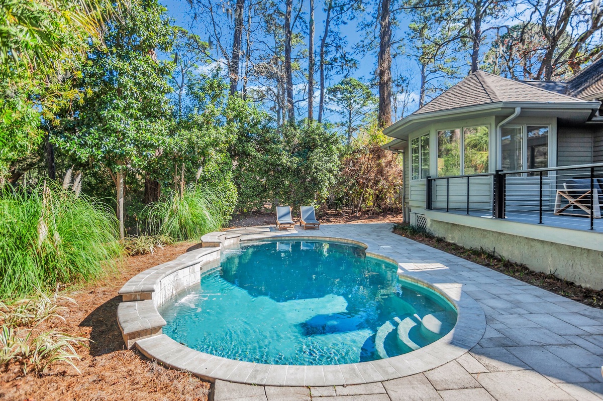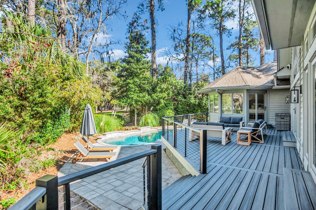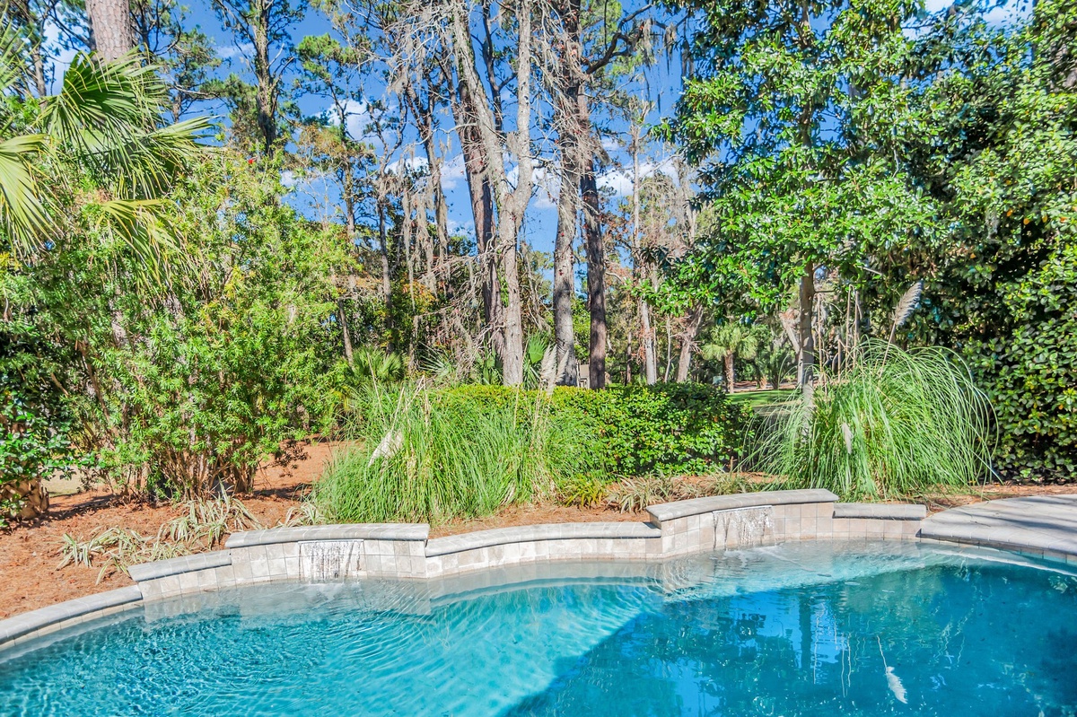 Surrounding the sparkling pool with its two tranquil water features, this rich greenery offers lush privacy, with just enough of a view to the golf course to see without being seen. As golfers tee off from the pro tees at Harbour Town Golf Links’ fifth hole, they’ll never know that you’re unwinding in luxury just beyond the treeline.
