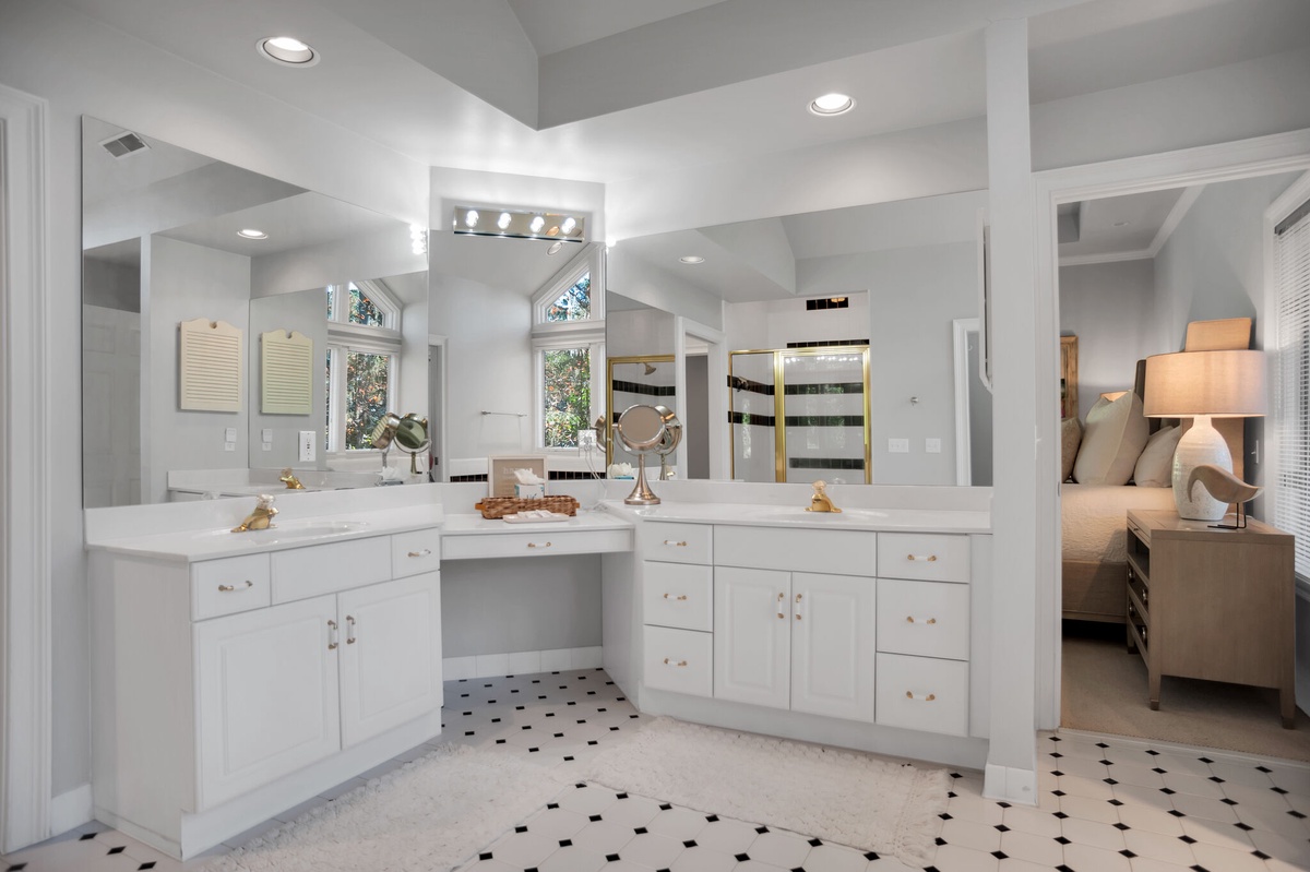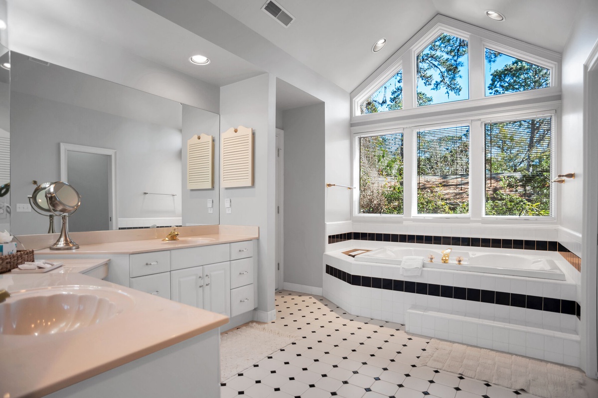 Finally, the primary suite samples each of the home’s many delights, with tall ceilings, private access to the rear patio, panoramic views of the forest, king-size bad, ceiling fan, flat-screen TV and opulent en suite. Soak in the roomy Jacuzzi tub, bathed in sunlight from tall private windows, enjoy spacious comfort thanks to his-and-her vanities, or indulge in the airiness of the cavernous walk-in shower.