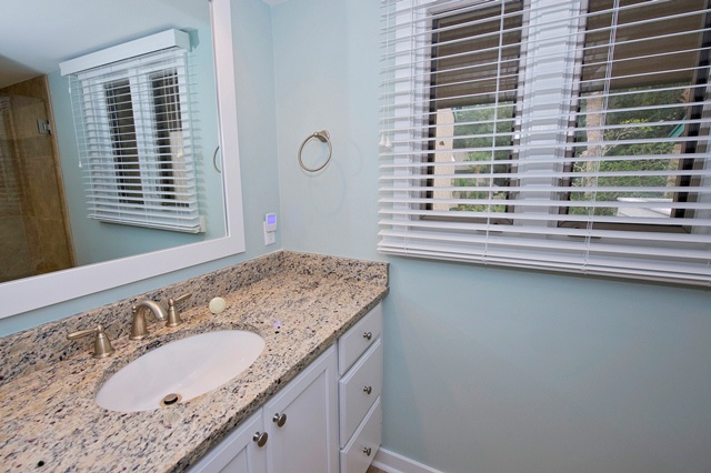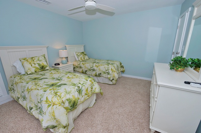 With a tropical motif, the second bedroom provides twin beds, bead board furnishings, ceiling fan and private balcony. Its bathroom includes a roomy vanity and glass door tub/shower.