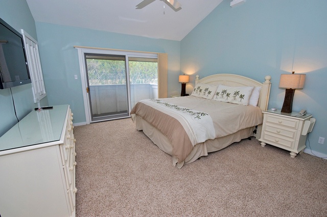 Up the staircase – which is open to the living room below – are two bedrooms. The master boasts a cathedral ceiling, king-sized bed, TV, ceiling fan and private marshview balcony. The bathroom includes a wide vanity and glass door tub/shower combination.