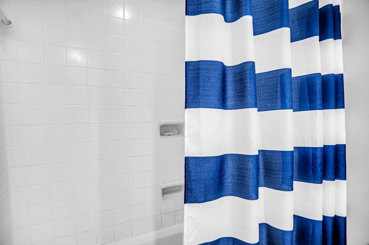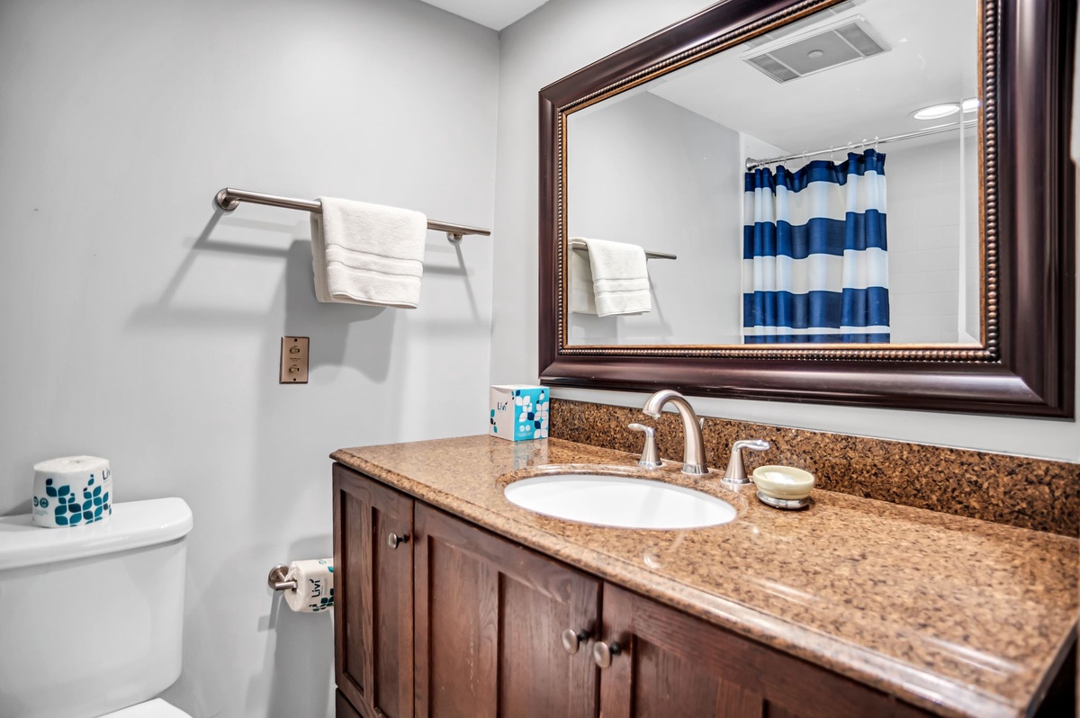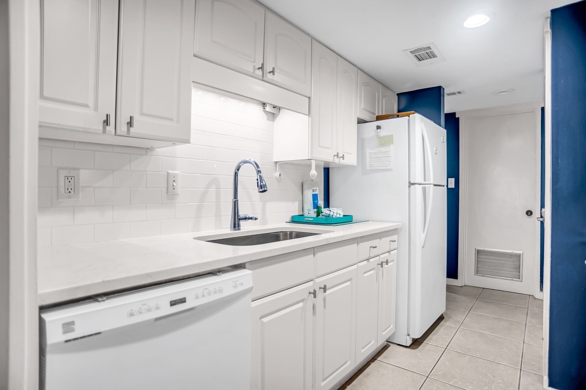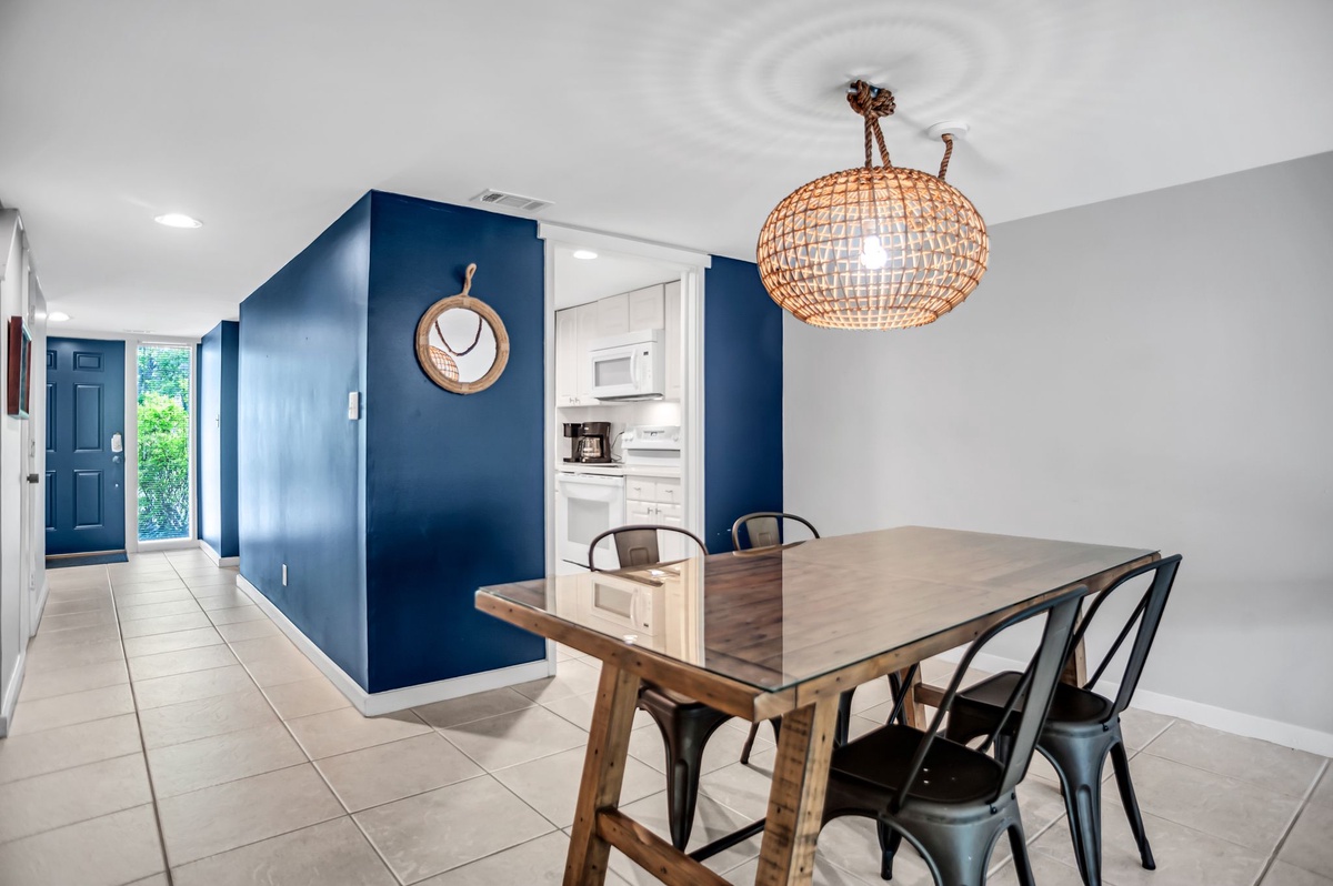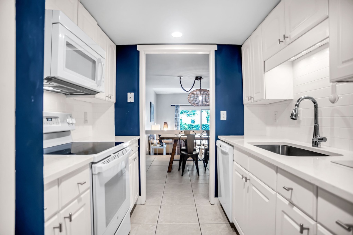 Nautical vibes of blue and white usher you in through tile floors to the open living space, starting with the grand dining room boasting seating for four. Convenient to this space is the galley-style kitchen, whose marbled counters gleam against the shine of updated stainless-steel appliances as they stretch toward the discrete washer and dryer.