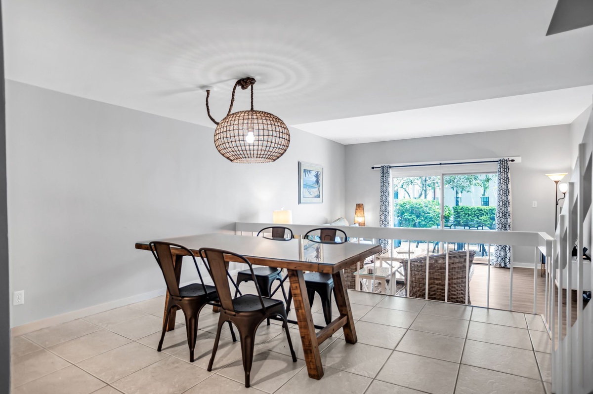 Stepping down from the dining room to the sunken living room, we find an oasis of Caribbean-inspired comfort with plush sofa flanked by dual armchairs facing a flat-screen TV. Sliders give way to a shaded patio kissed by sea breezes, boasting al fresco dining for six.