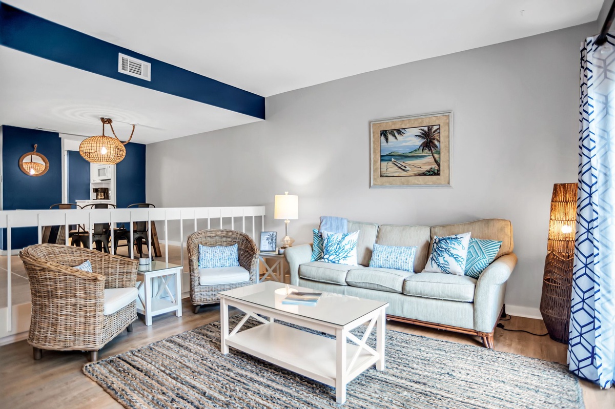 Recently refreshed with a refined coastal motif, this spacious two-bedroom vacation villa offers comfort and style just a short bike ride away from Harbour Town.