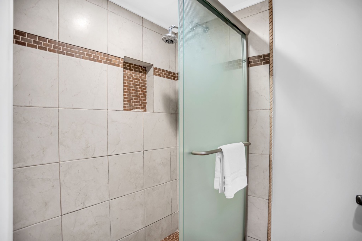 Heading up the floating stairs from the foyer, where a discrete powder room offers convenience, we find two guest suites designed around lush comfort and effortless style. In the first, two twin beds share a space with flat-screen TV, private balcony and en suite bath with tub and shower. In the second, vaulted ceilings lend spaciousness to a full suite with king-size bed, private balcony gazing out toward the community pool, and spacious en suite with walk-in shower.