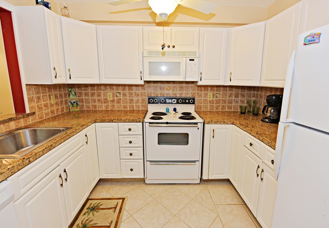 Step up and you’re in the main dining room, with wide maple table offering seating for six below beautiful vaulted ceilings for a sense of spaciousness and grandeur. Opened to this space through a wide pass-through is the kitchen, with its tile backsplash, mottled granite counters and full range of appliances and amenities.
