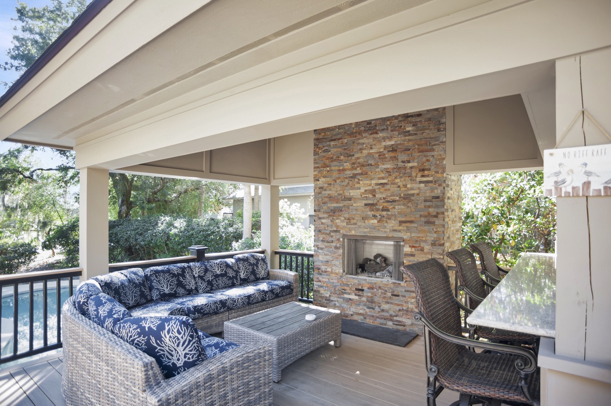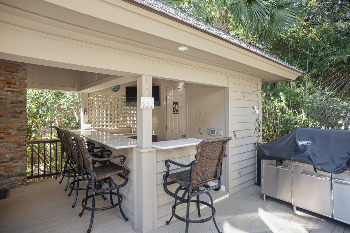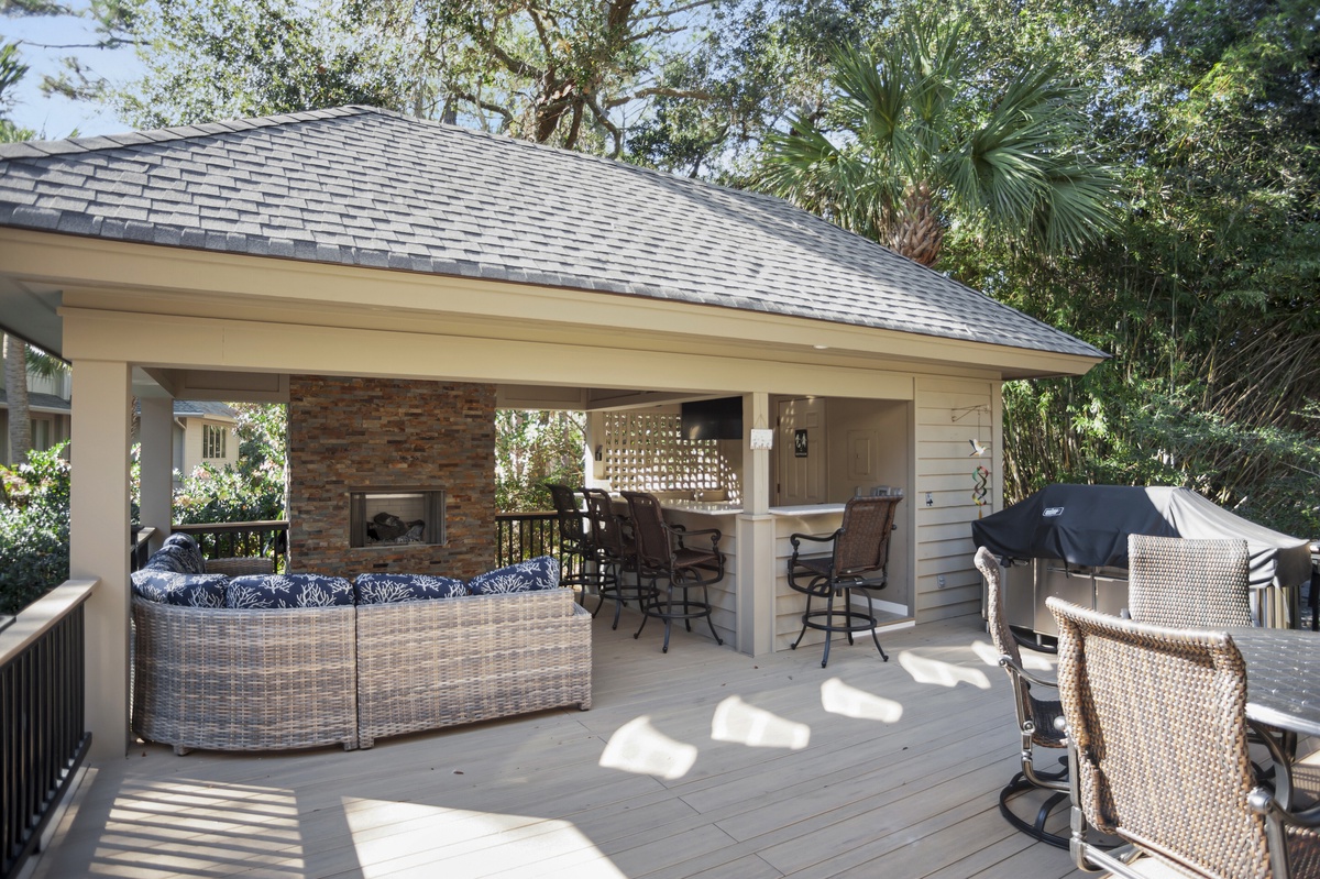 But as much as this property evokes the classic elements of Southern architecture, its outdoor spaces speak volumes about the natural paradise with which it is surrounded. Head through sliders in the living room and you’re at the heart of an outdoor party that will make your vacation unforgettable. A sprawling deck offers al fresco dining for six as well as a massive Weber grill, but it’s the covered patio where the party truly takes place.