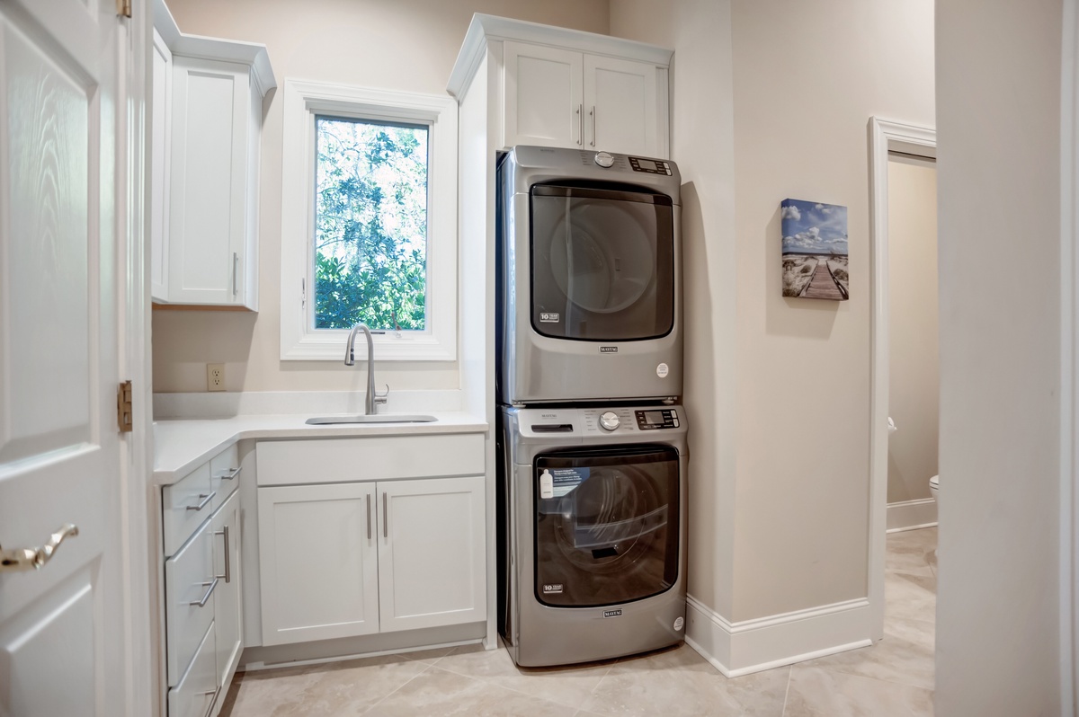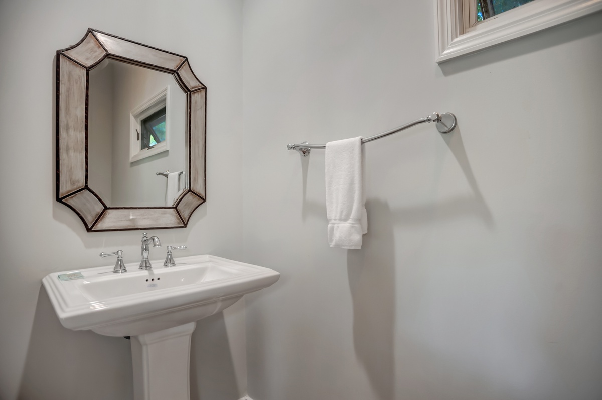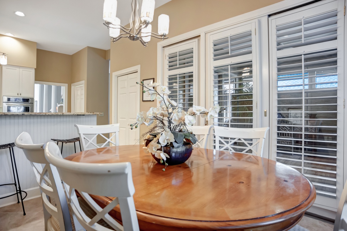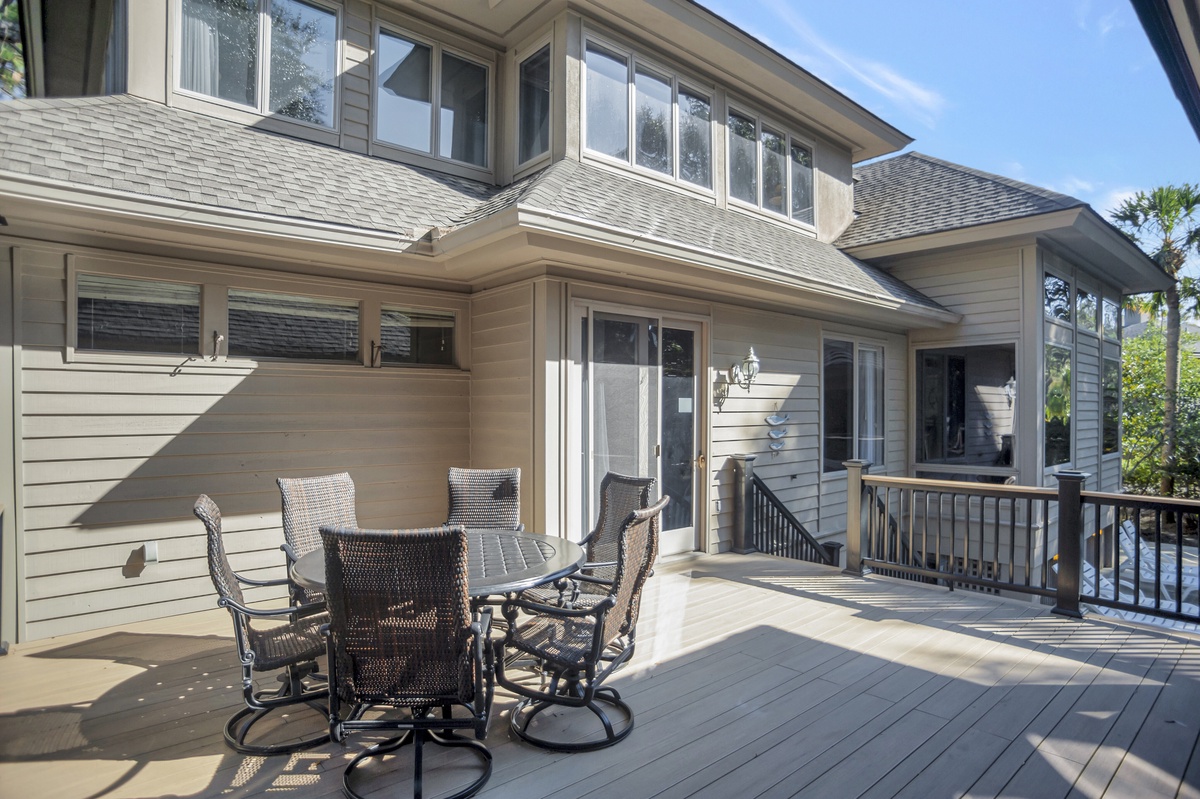 But as much as this property evokes the classic elements of Southern architecture, its outdoor spaces speak volumes about the natural paradise with which it is surrounded. Head through sliders in the living room and you’re at the heart of an outdoor party that will make your vacation unforgettable. A sprawling deck offers al fresco dining for six as well as a massive Weber grill, but it’s the covered patio where the party truly takes place.