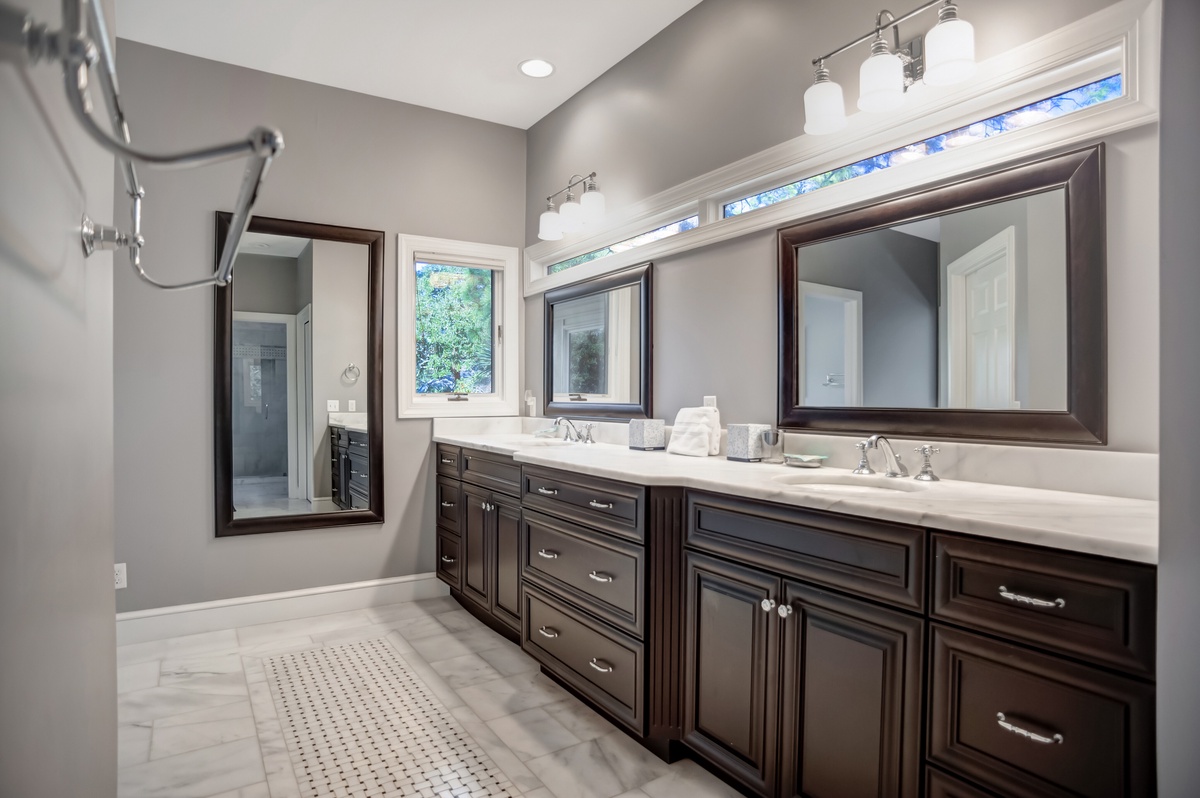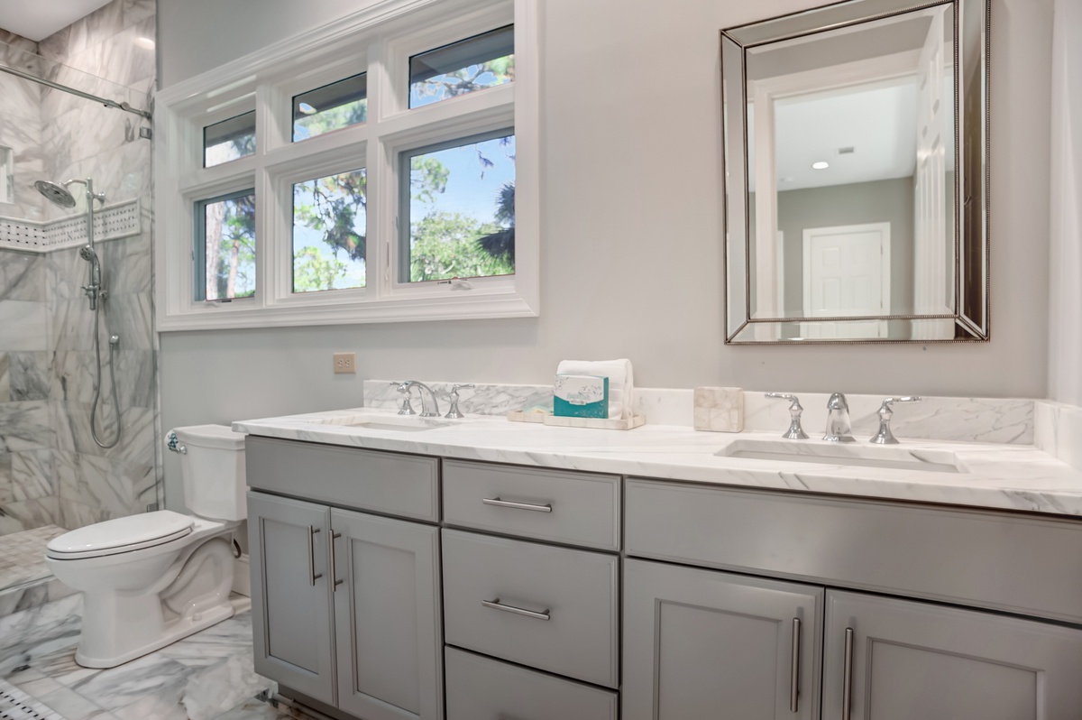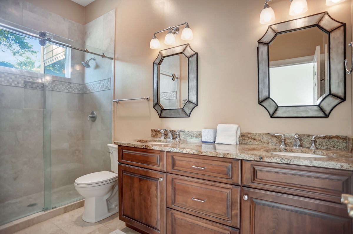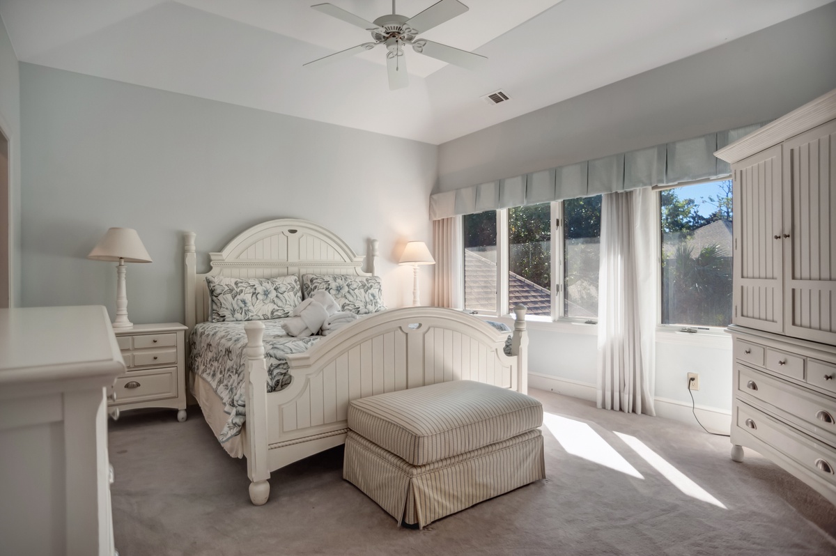 The second serves as a suitably grand owner’s suite, with the bed and bath wrapping around a massive walk-in closet. The bedroom enjoys a plush king-size bed as well as a flat-screen TV and a private sitting room with ceiling fan and fold-out loveseat, with windows in each gazing down on the pool. The bath side of this wing pampers with equal grace, indulging with a massive walk-in shower, dual-basin vanity and a private soaking tub which can be closed off for spa-like serenity.