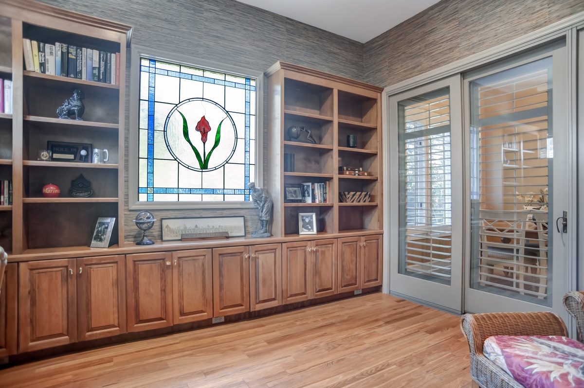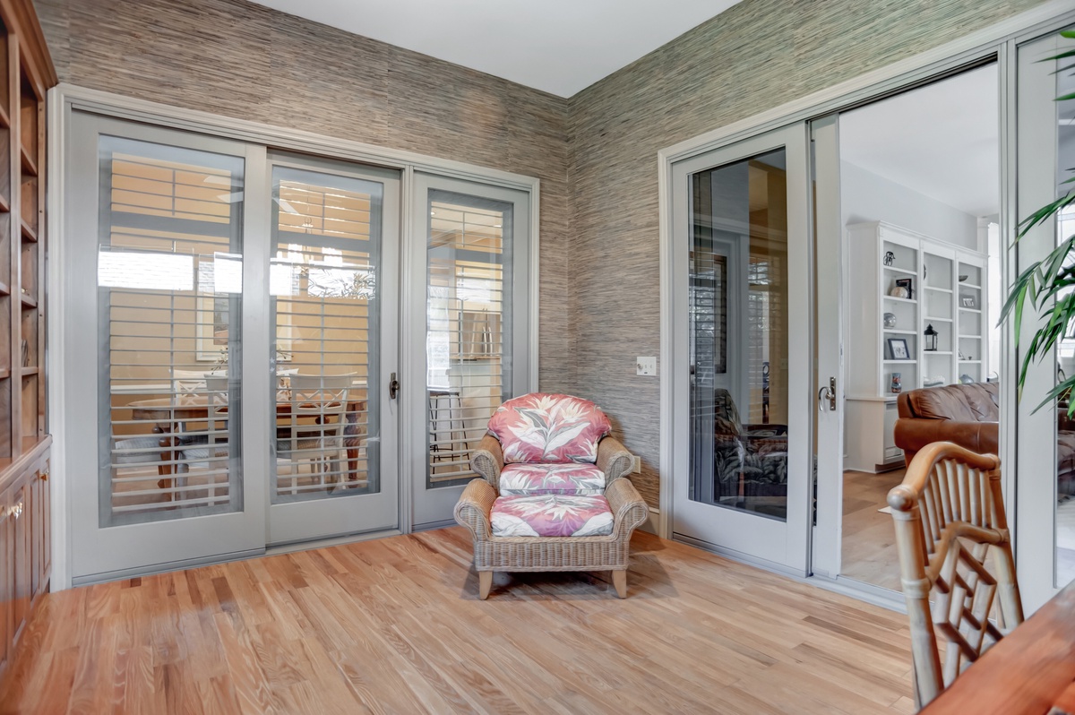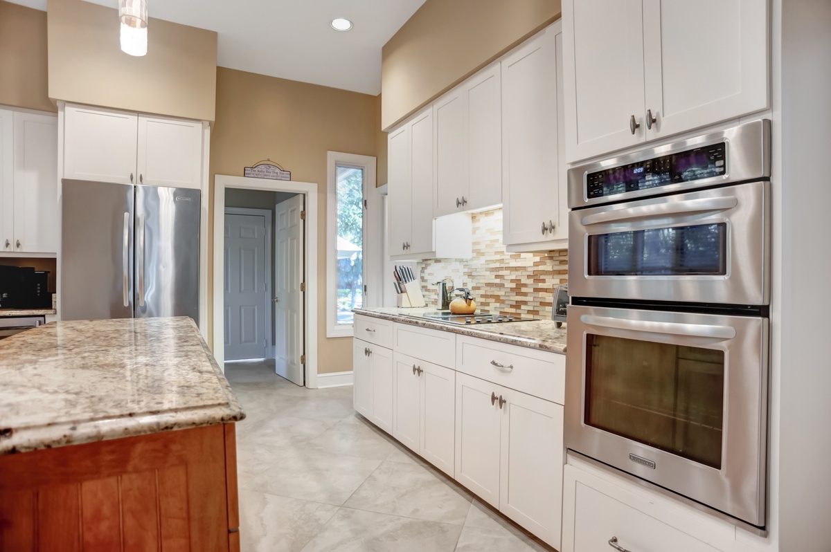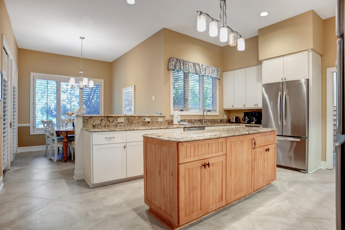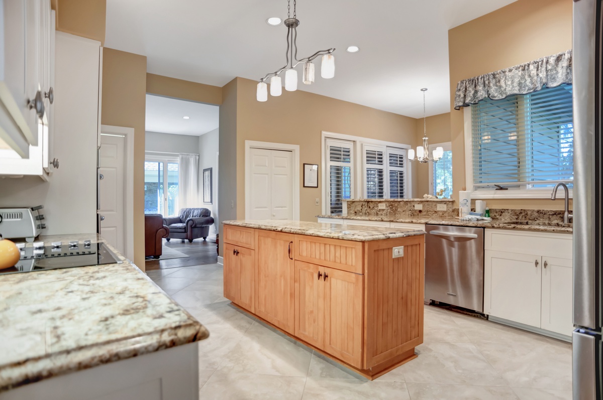 The grand kitchen sprawls just on the other side of a wall of built-ins, boasting a spacious center island of granite around which is wrapped a gourmet paradise with updated stainless-steel appliances including flat cooktop stove and French door refrigerator. Nearby informal dining offers seating for six surrounded by plantation-shuttered windows for blissful natural scenery.
