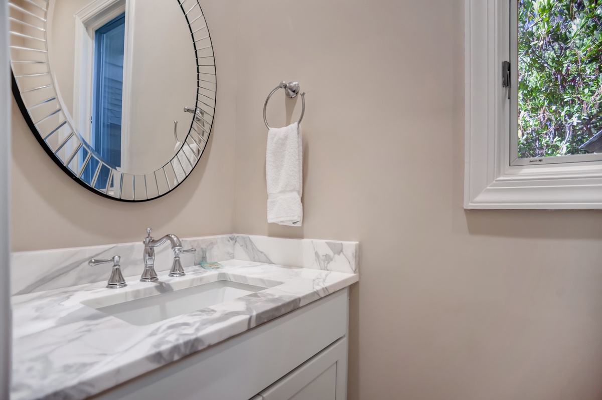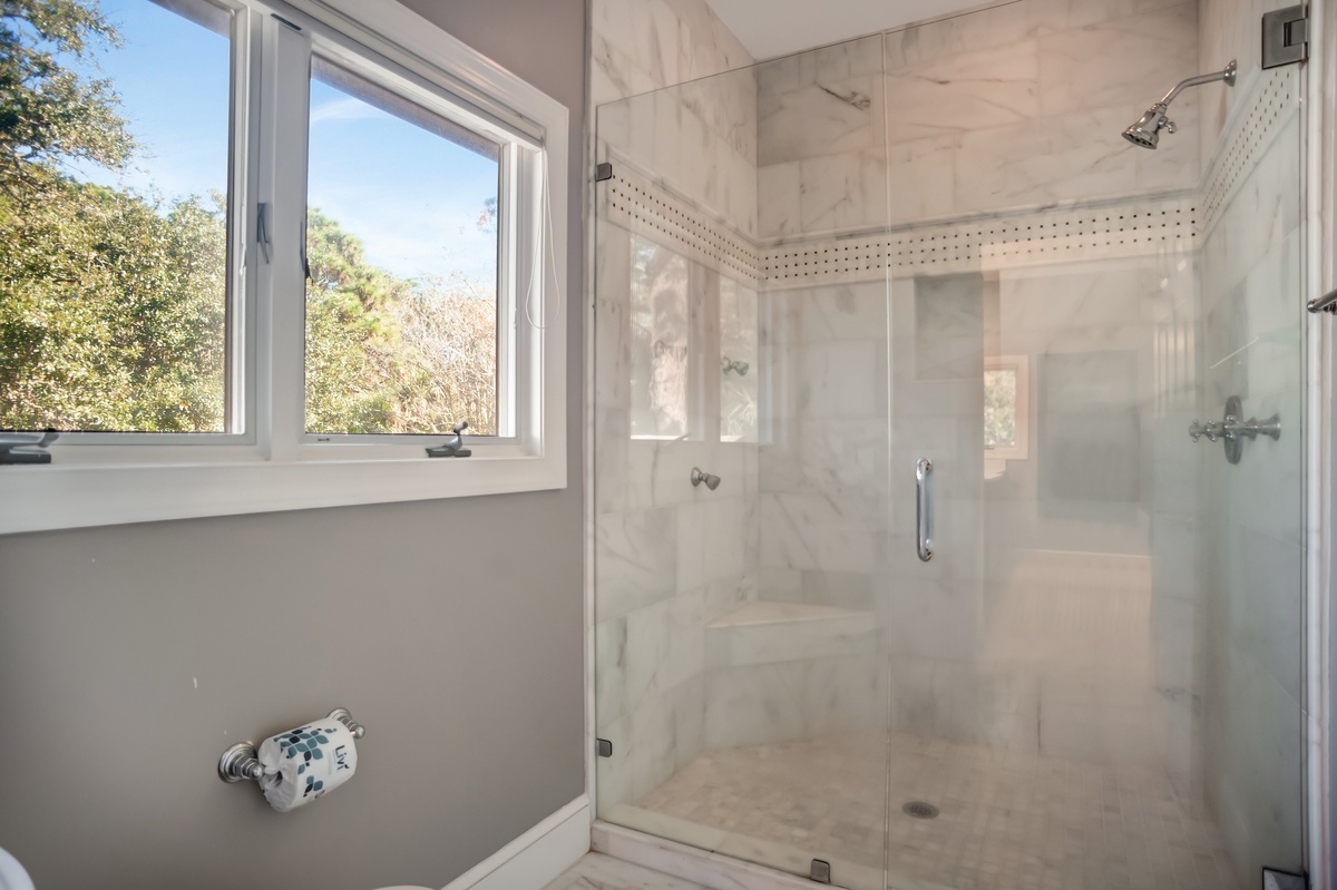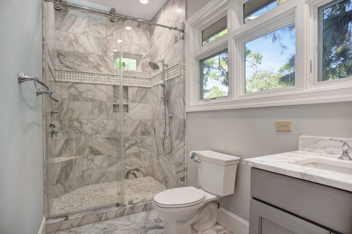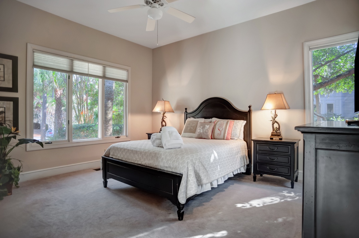 Two further guest rooms can be found on the ground floor. The first enjoys short-pile carpeting in a spacious room boasting queen-size bed, flat-screen TV, ceiling fan and windows on three walls for picturesque natural views. This space enjoys access to a full bathtub, shower and dual-basin vanity. The second, a full suite, sees a king-size bed set amid plentiful windows in a space with flat-screen TV, expansive closets, and en suite bath with walk-in shower and dual-basin vanity.