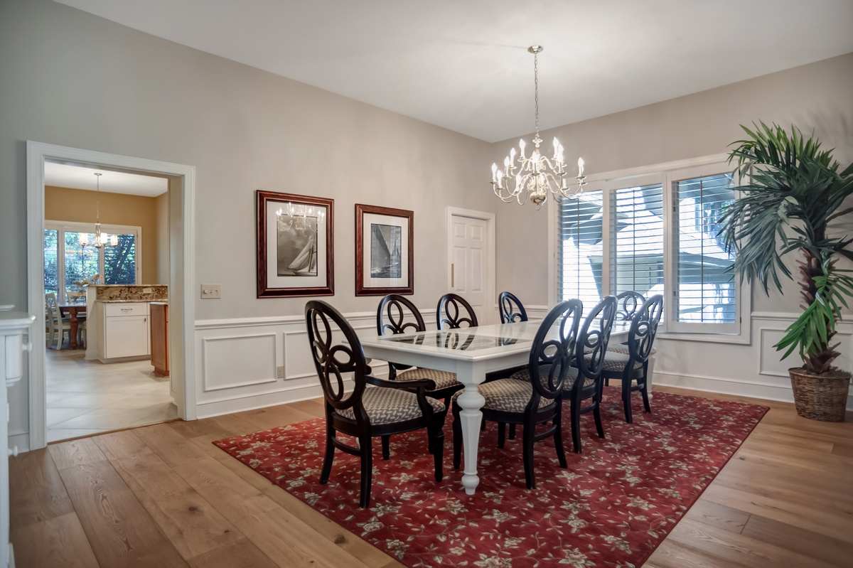 The classic trappings of Southern architecture draw you in, from the dazzling foyer with its soaring balcony to the formal dining room seating eight beneath a sparkling chandelier and even into the stately study with its tall ceilings, stained-glass window, and built-in bookshelves.