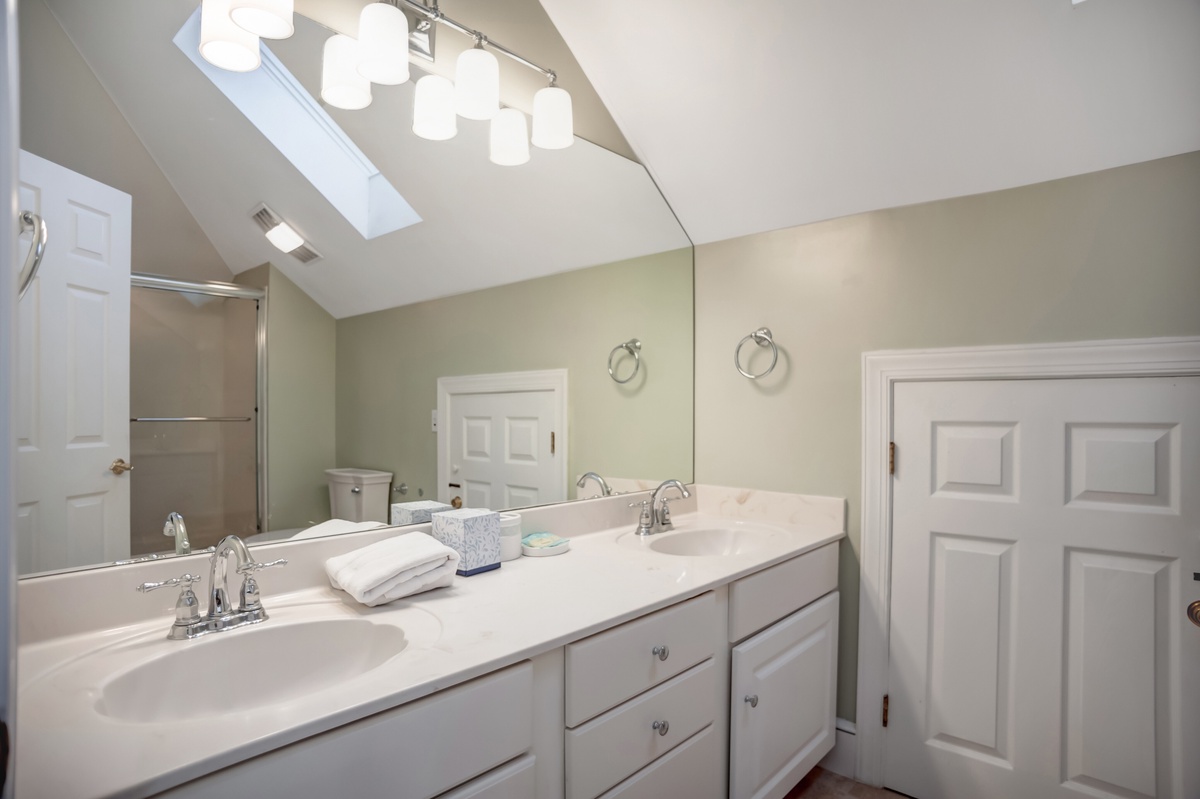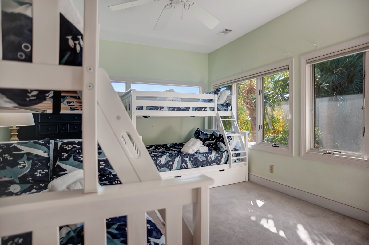 The remaining suites can be found just up a sweeping staircase on either side of a wide catwalk overlooking the great room and foyer. The first suite, perfect for younger guests, boasts a pair of twin-over-double bunkbeds with trundles, flat-screen TV, ceiling fan, views out to the pool and private bath with tub, shower, and twin scalloped basins draped in sunlight from the towering skylight.