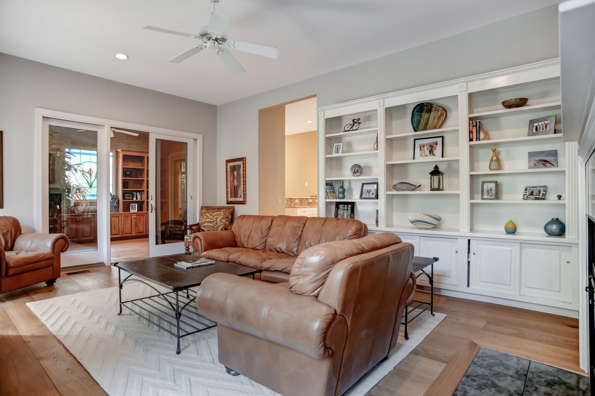 This expansive set to scale is perfectly illustrated in the great room at the heart of the home, where the entire group can gather around a classic oak table fronting a decorative pass-through fireplace amid a wealth of plush armchairs and a sofa. Adjoining this space, and sharing the fireplace, is an intimate den with rich leather sofa and armchairs facing a flat-screen TV.