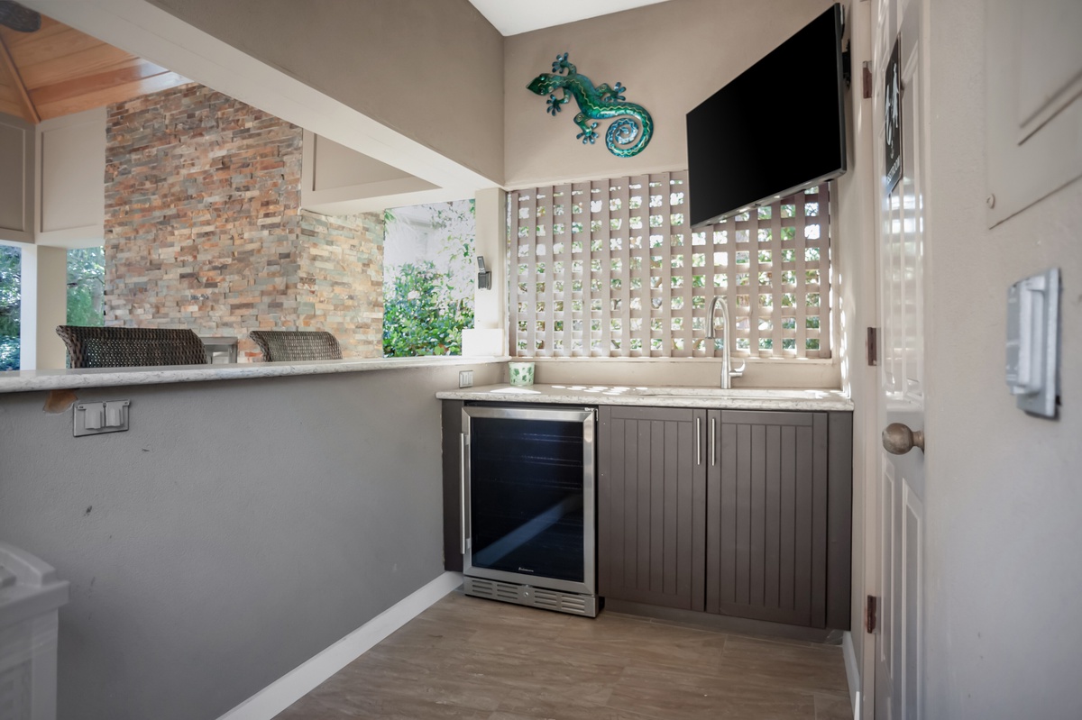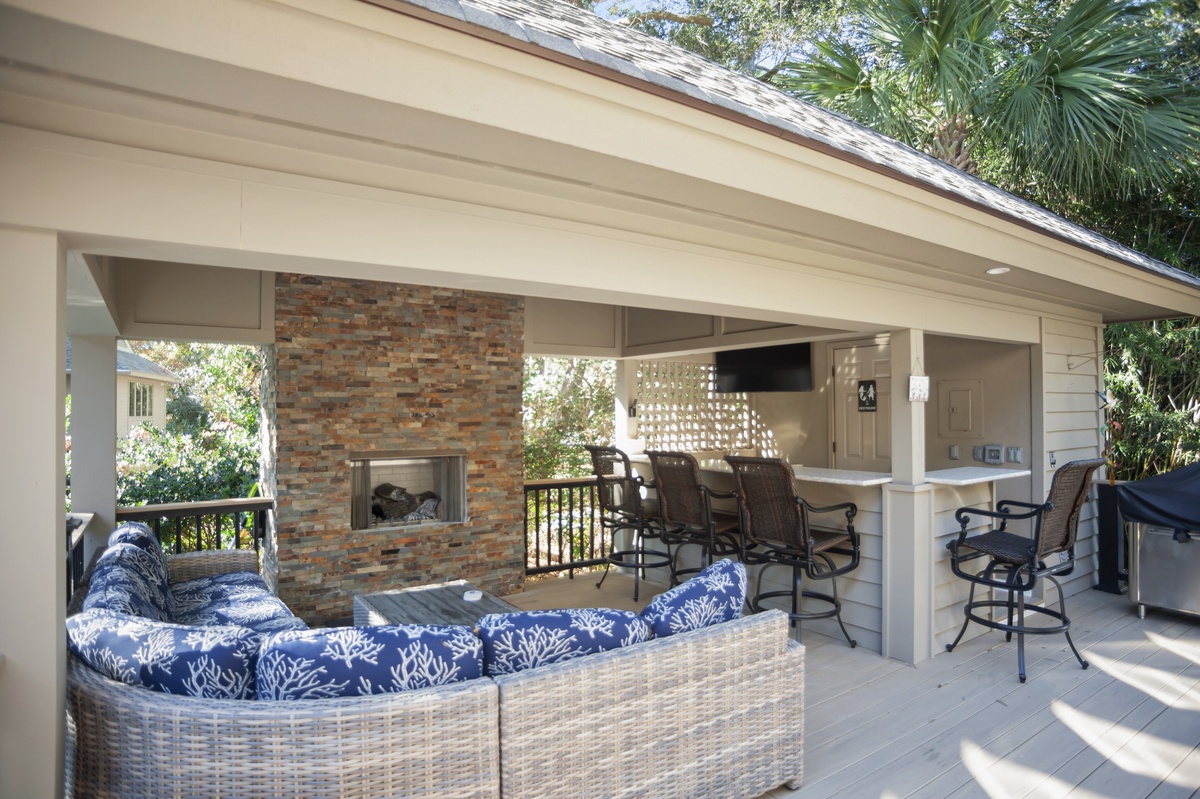 Here in the shade of a wide roof, outdoor furniture rings a stone fireplace for late-night get-togethers, while the wraparound granite of the bar ensures the good times flow, with beverage cooler, outdoor TV and convenient half bath. Step down and you’re basking in the view of the pool’s sparkling waters, ringed by lush landscaping for privacy.