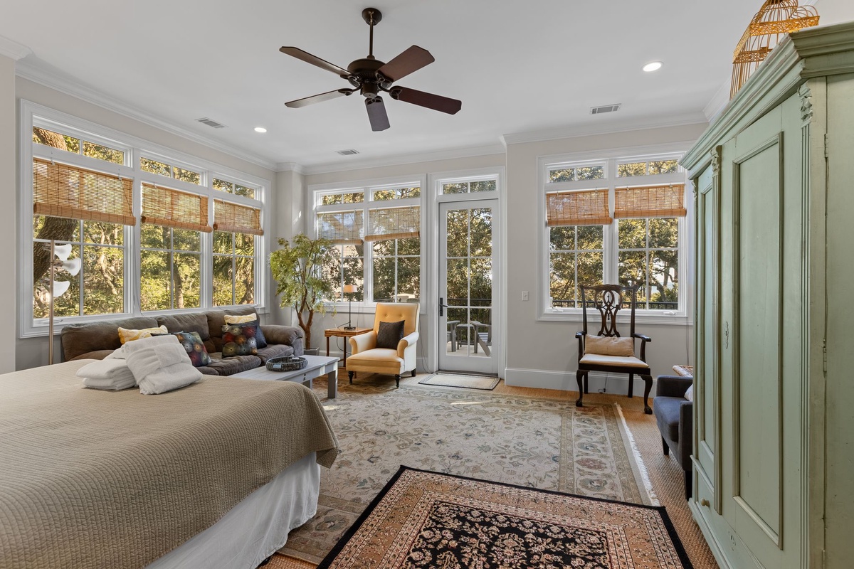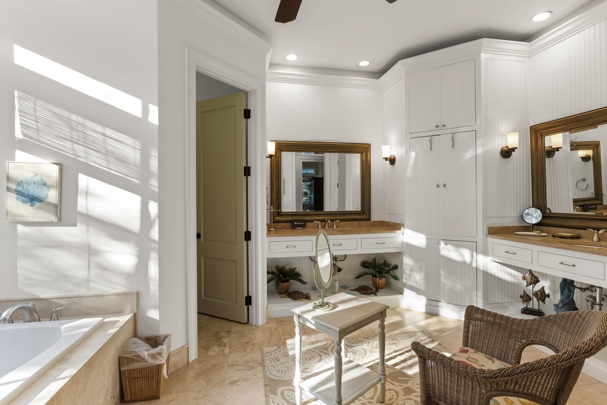 The two rear, ocean-facing bedrooms each feature a king bed, sitting area, TV, and luxurious en suite bath with dual sinks, sunken tub, and spacious tiled walk-in shower. Each room opens directly onto the shared 2nd-floor balcony—perfect for enjoying sunrises, ocean breezes, or a quiet read from the small libraries just outside the bedrooms.