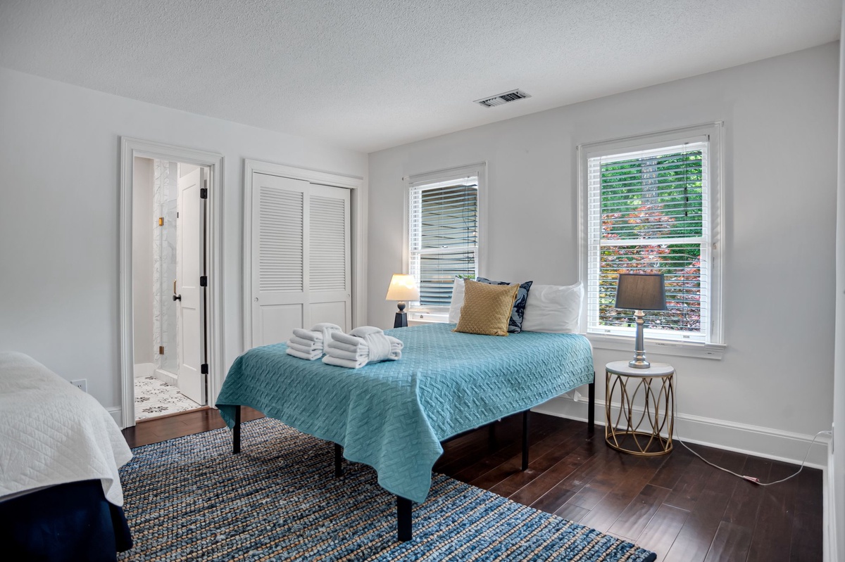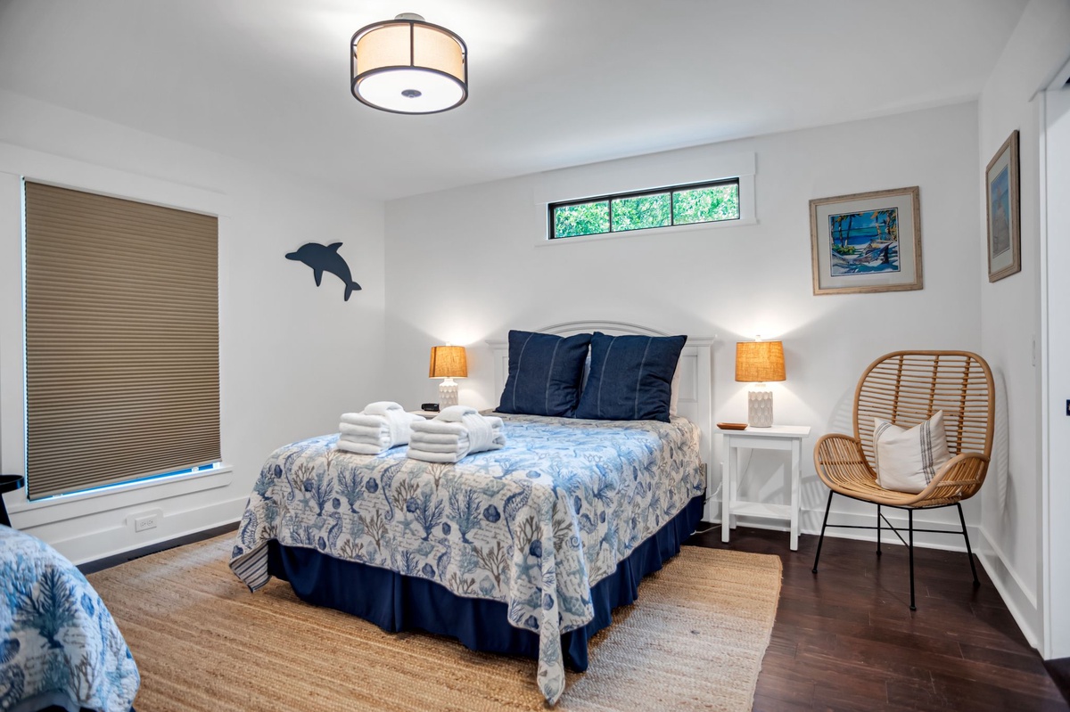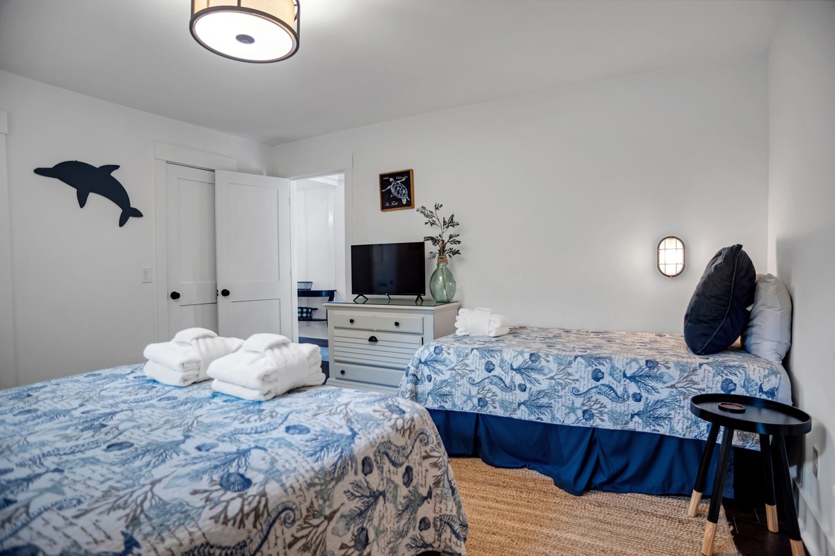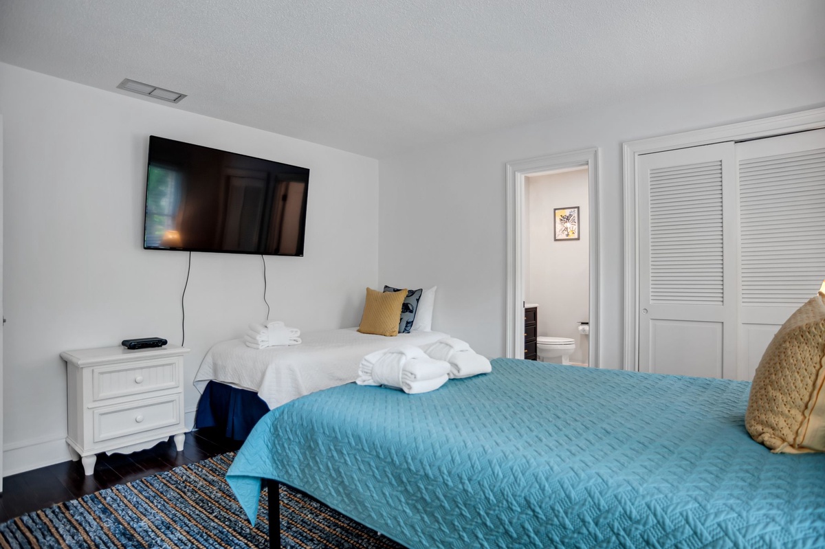 The upstairs guest room can be found behind French doors overlooking the foyer, guiding you into a suite with one queen and one twin bed, TV and en suite with walk-in shower.