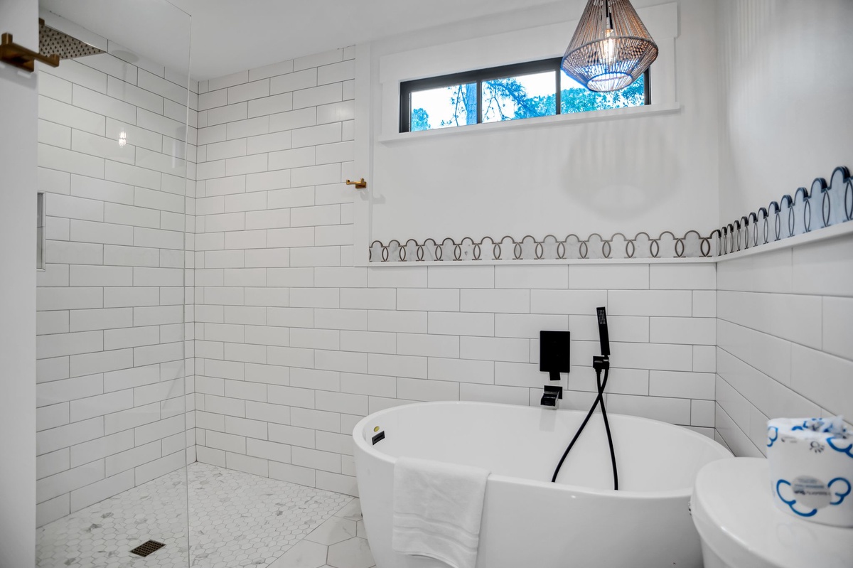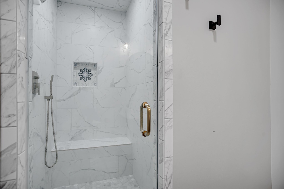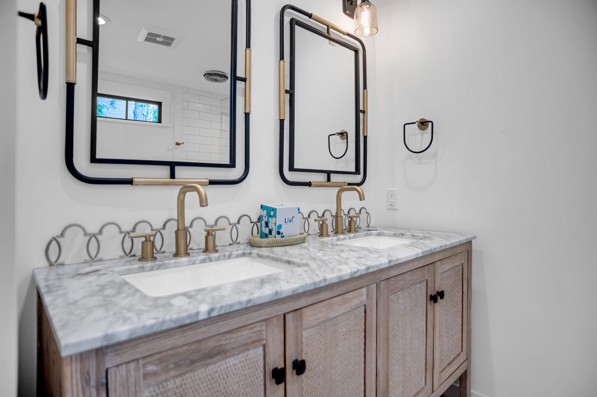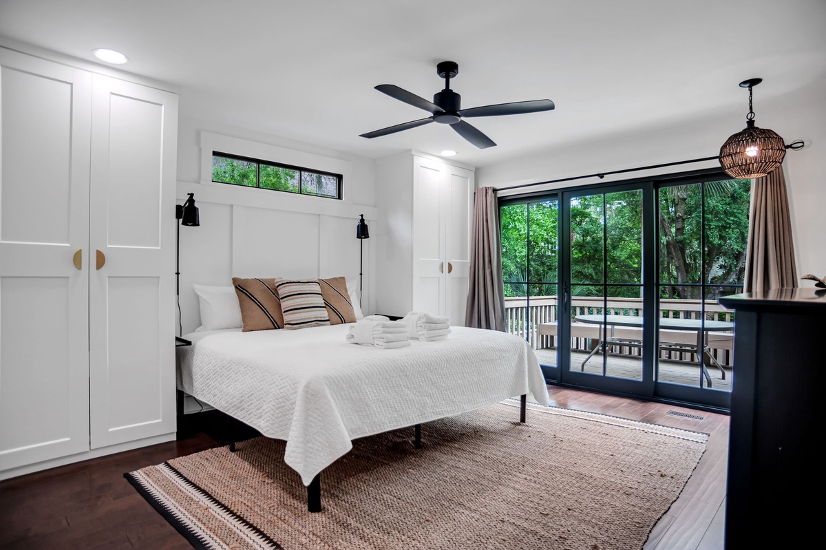 The upstairs guest room can be found behind French doors overlooking the foyer, guiding you into a suite with one queen and one twin bed, TV and en suite with walk-in shower.