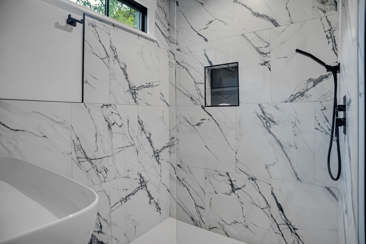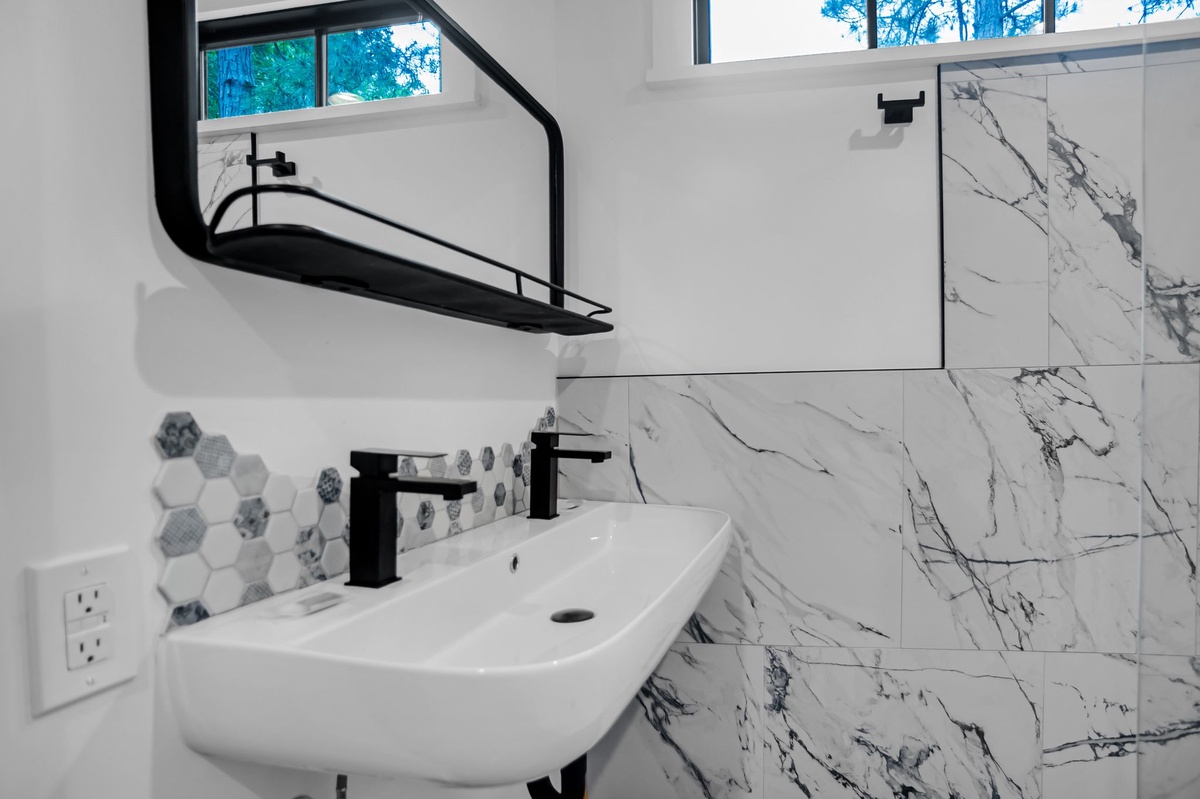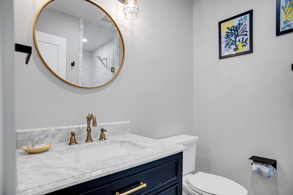 Exquisite comfort and style informs all four of this property’s guest rooms. Starting on the ground floor, we find a foyer-adjacent suite with a nautical theme surrounding a queen bed, twin bed and flat-screen TV, and carrying into the en suite with tub and shower. A second ground floor suite enjoys private access to the rear patio as well as a king-size bed, flat-screen TV and private access to a full bath with tub and shower.