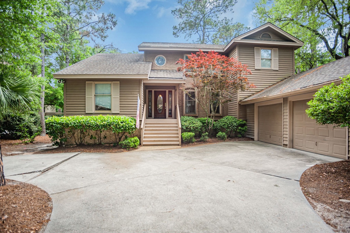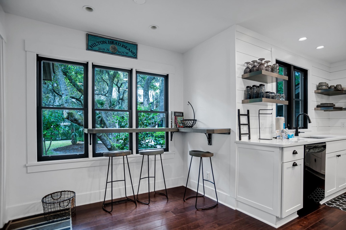 The open spaces of the home sparkle with sunlight, streaming in from the skylights in the main living area and through a dazzling stain-glass accent window in the foyer. They illuminate gathering spaces that have been wonderfully updated to reflect a modern Coastal chic vibe with Lowcountry flair.