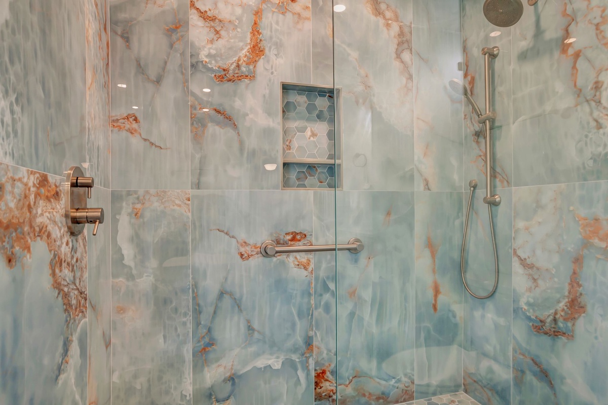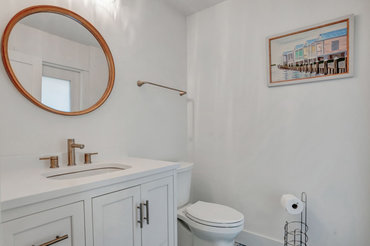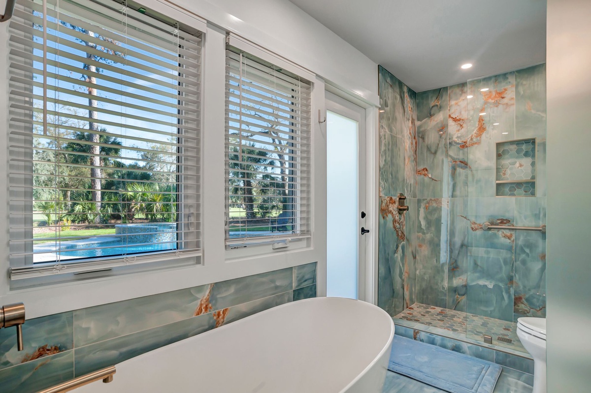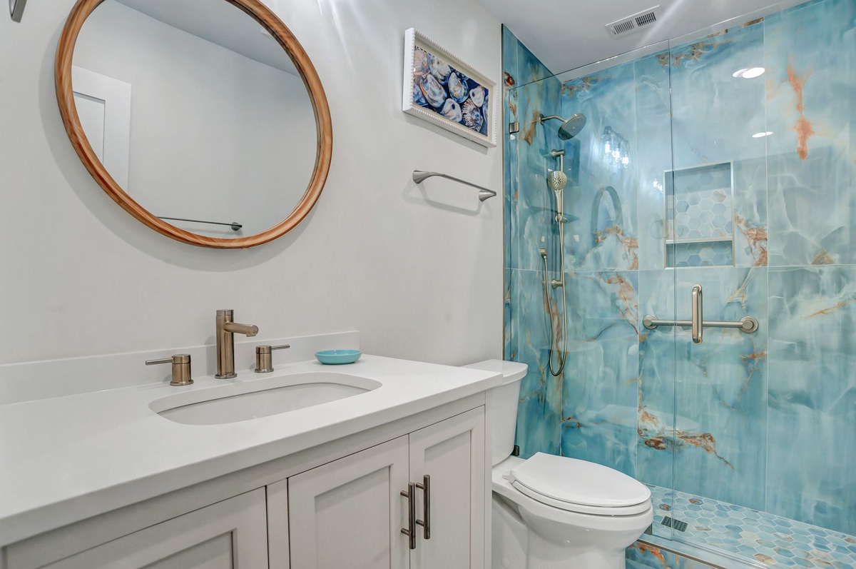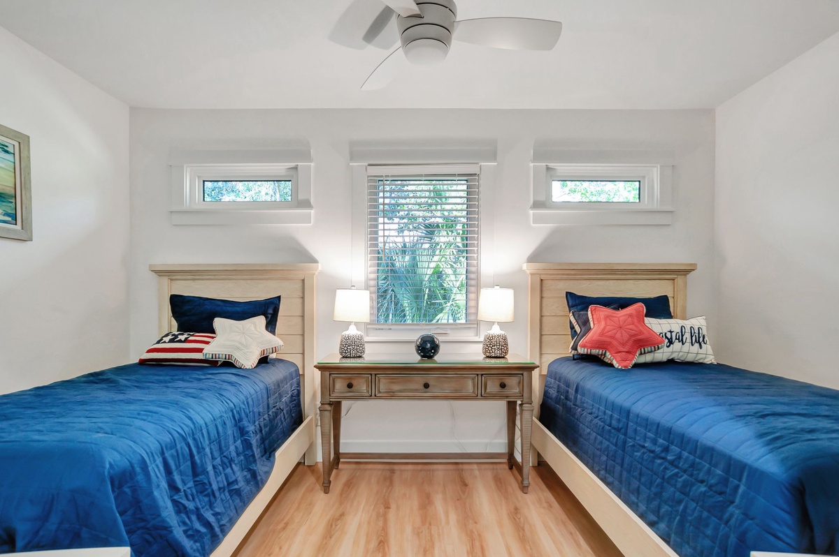 Every member of your party will rest their head in stylish comfort in the four guests rooms. In two of these rooms, you’ll find a queen-size bed set before a wide flat-screen TV with ceiling fans and spacious closets. One of these rooms also conceals a tucked-away bedroom with dual twin beds behind French doors. These three guest rooms share access to a full bath with walk-in shower.