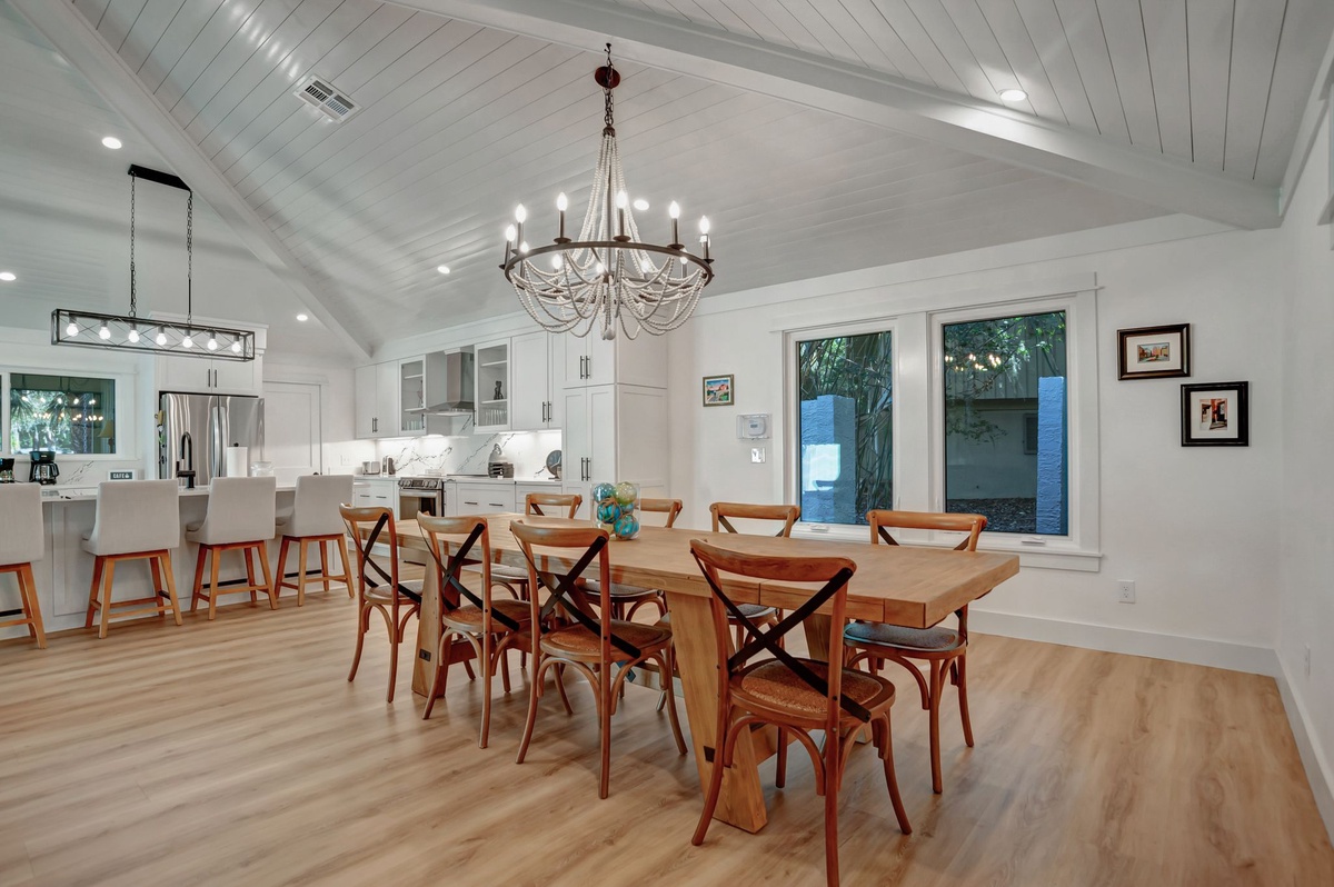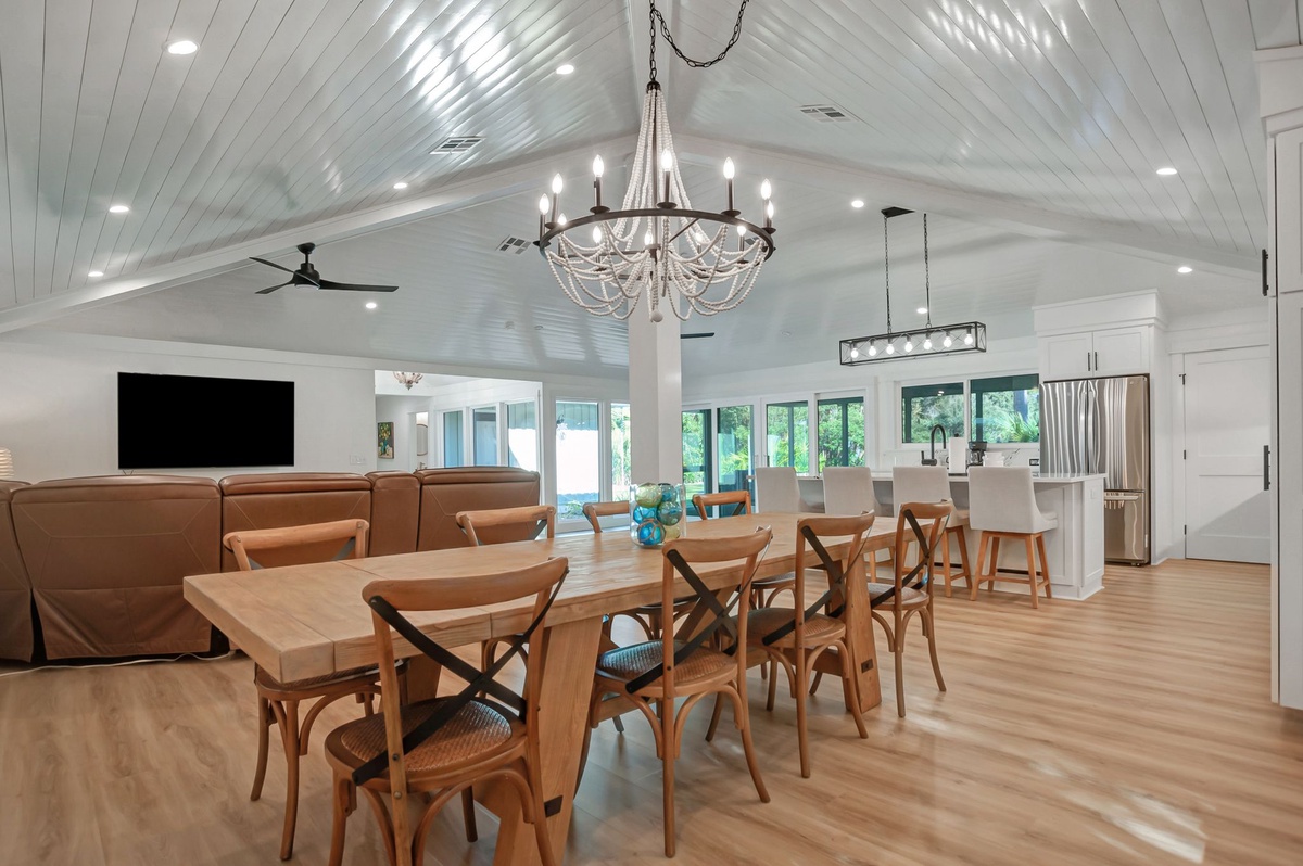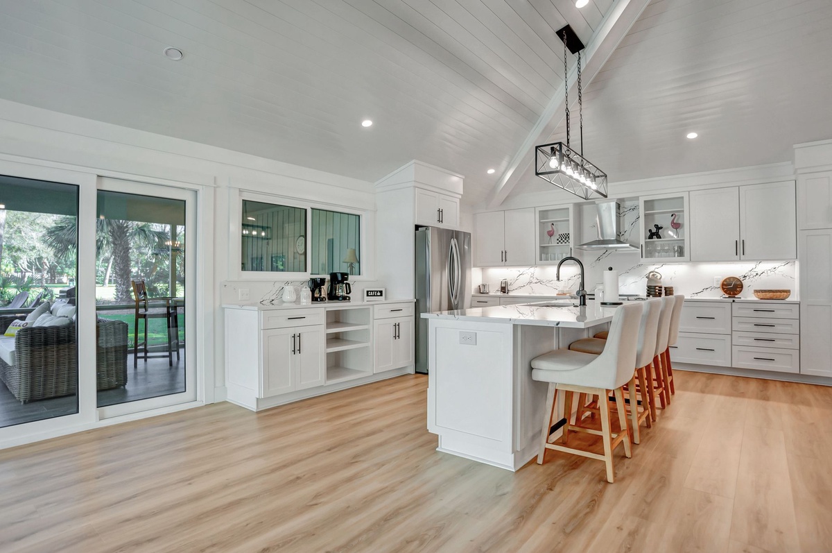 At one end of this gallery you’ll find the open living space set beneath a soaring pyramid ceiling. Here you can unwind on the sprawling sectional sofa with integrated recliners set before a flat-screen TV; you can seat the entire party around the wide dining table with seating for eight; and you can feed them all in the wonderfully updated kitchen with stainless steel appliance and dazzling stonework.