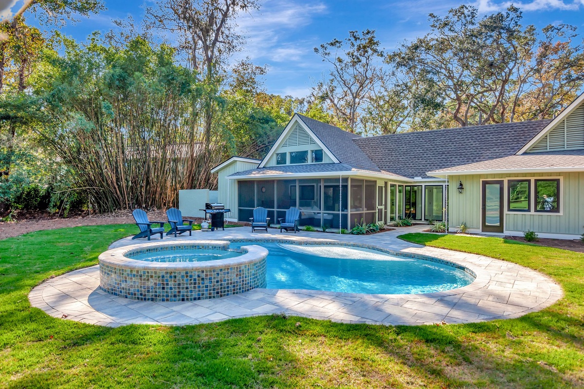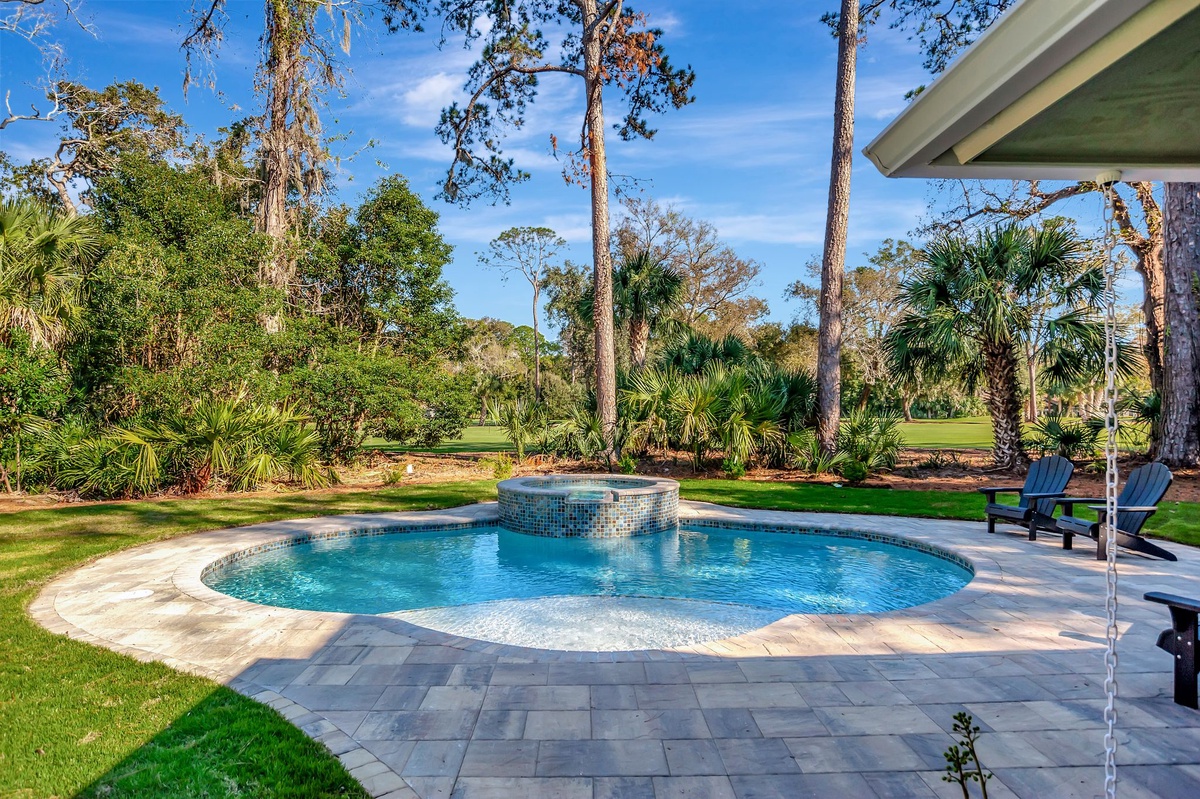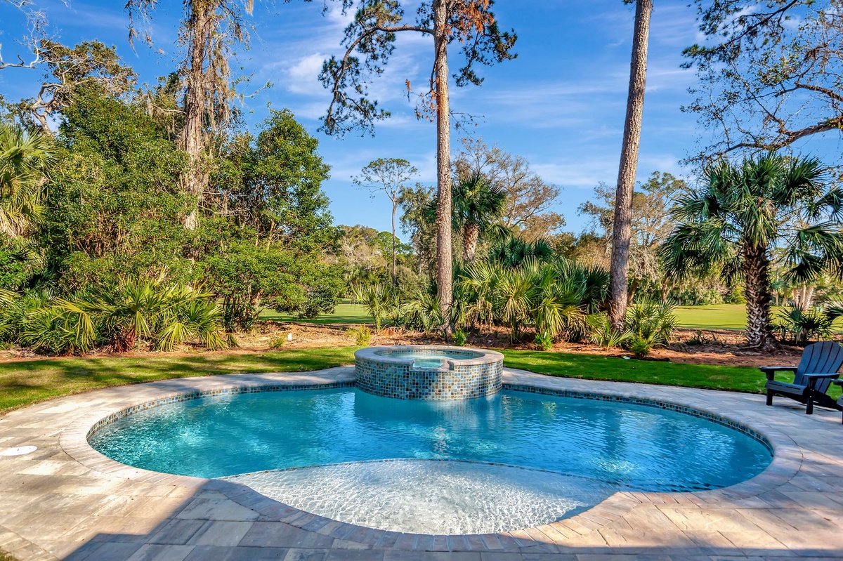 This room also provides entry to the home’s marvelous outdoor living spaces. A wide screened porch offers al fresco relaxation, with a convenient pass-through to the kitchen for entertaining. Take a few more steps, and you’re soaking in golf scenery beyond the sun-dappled pool deck with splash-down jacuzzi. A half-bath indoors also opens to the pool deck for convenience.