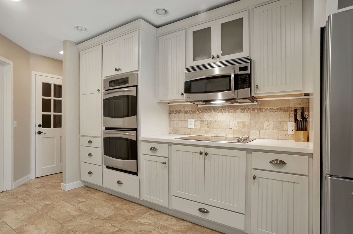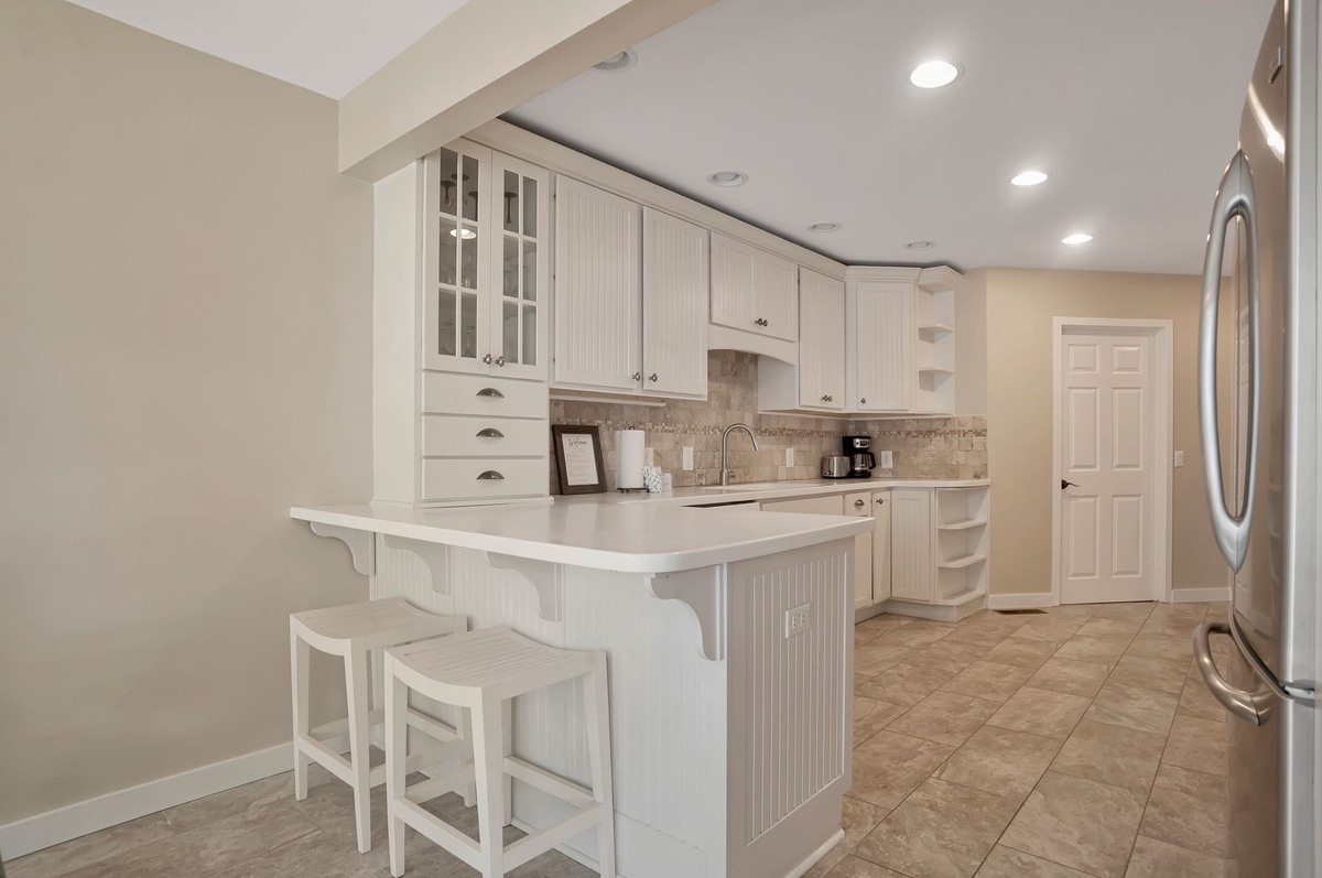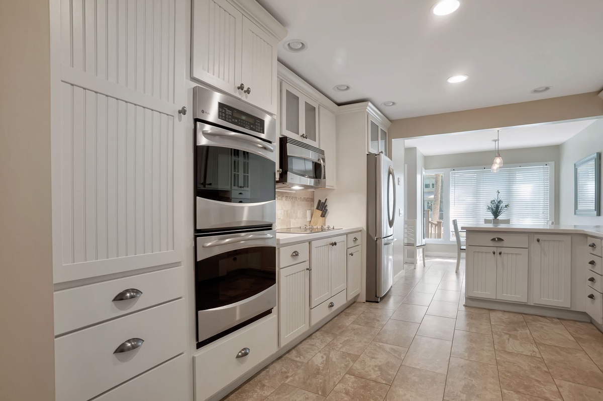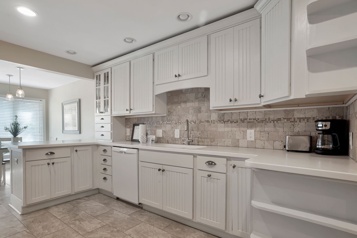 With white beadboard cabinetry, the kitchen showcases granite countertops, brand new stainless steel appliances, travertine flooring, a lovely stone-tile backsplash and counter seating for two. A breakfast table, windowside, seats four and features pendant lighting above. Nearby is a laundry room, outfitted with a full-sized washer and dryer, granite workspace and a utility sink. The home also features a two-car garage.