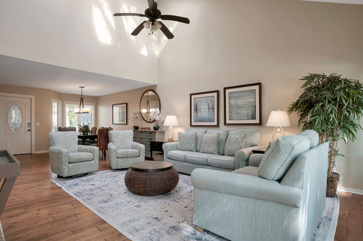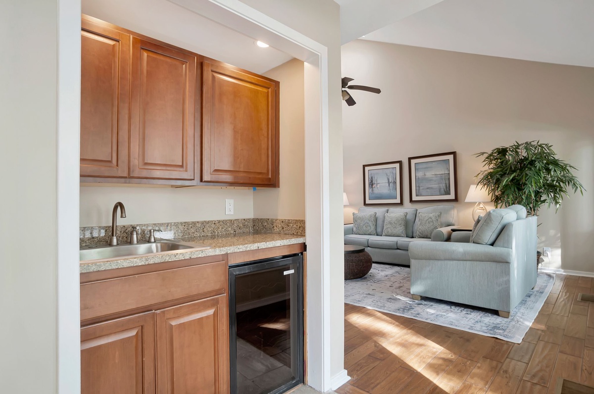 Dark wood floors grace the living and dining area, a combined space that invites friends and family to gather. The dining room seats eight at its stylish table, and is open to the living room, adorned in a palette of sky and sand. With a sleeper sofa, plus a wall-mounted flat screen TV with DVR, this room views the private Turtle Lane pool. Just outside the living room is your own covered porch with wicker seating, also poolside.