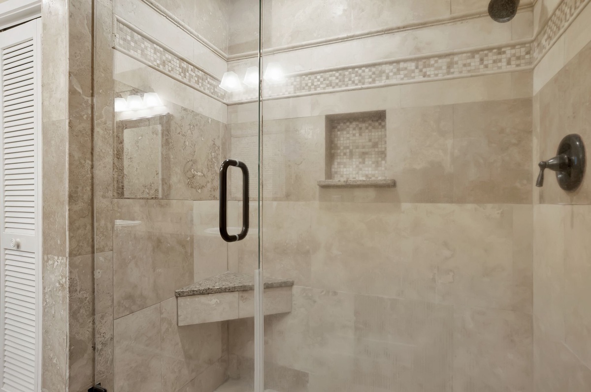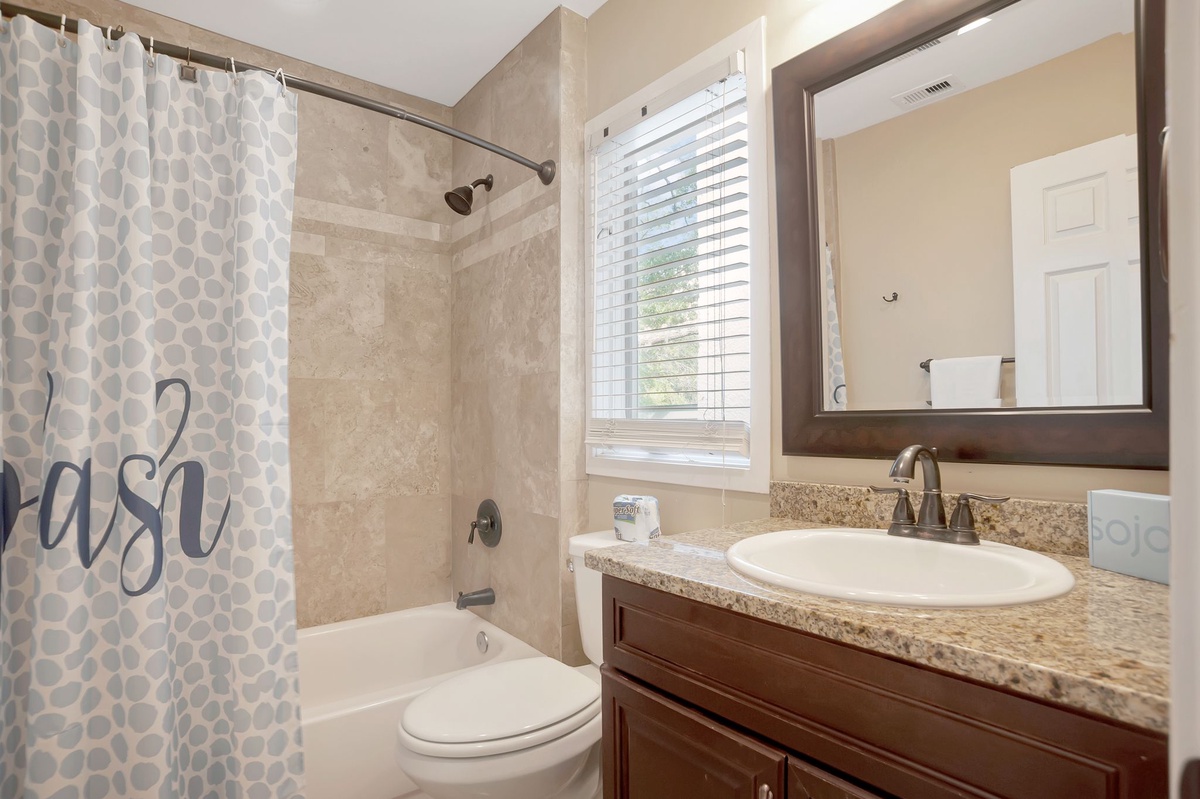 Up a half level is a guest bedroom, in aqua and bronze tones and offering two queen beds. The bedroom also includes a flat screen TV, DVR and two closets. Its private bath holds a tub/shower combo and granite vanity with oil-rubbed bronze fixtures.
