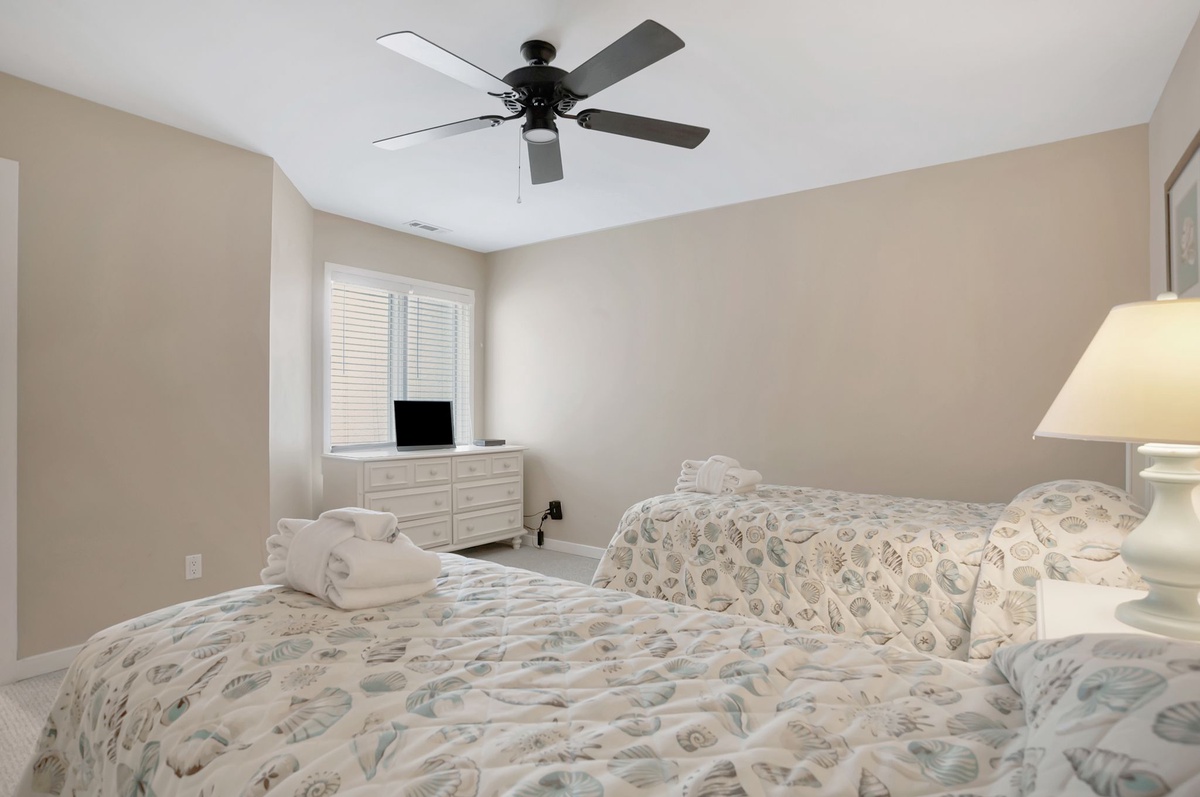 In cream with turquoise accents, the third bedroom features two twin beds in a shell motif, plush carpeting, a walk-in closet and a flat screen TV with DVR. The private bath holds a granite-topped vanity and a tub/shower combination.
