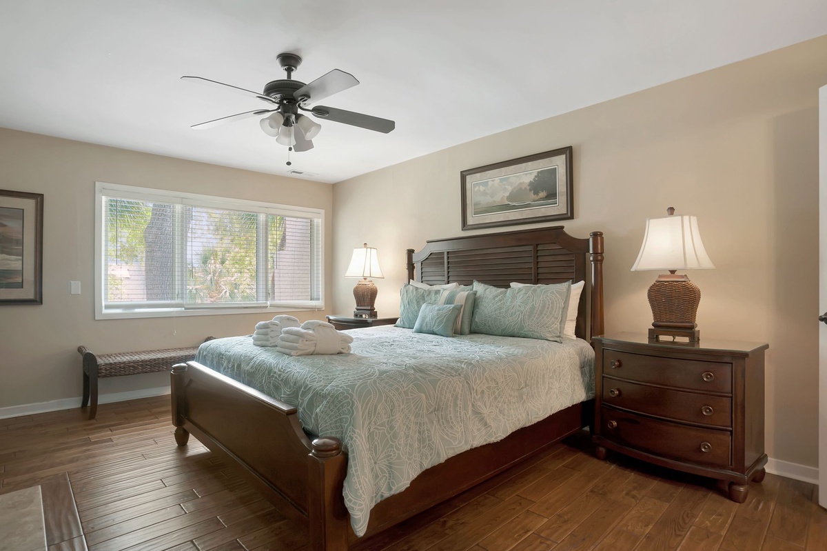 Continuing up another half level are two additional bedrooms including the master. A serene and spacious retreat, the master bedroom holds a grand king-sized bed with gauzy white spread, wood flooring and a view of the pool and palmettos. The room also includes a dark-blade ceiling fan and wall-mounted flat screen TV. In elegant tan with black, the private bathroom holds a wide granite double vanity with oil-rubbed bronze fixtures and a roomy stone, dual-head shower.