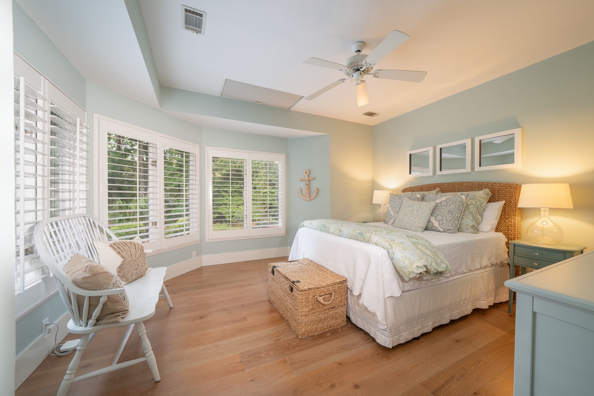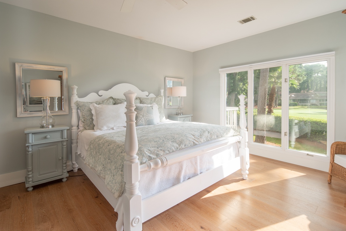 Stunning golf views, immaculate updates and a sense of spaciousness all come together in the master suite, with a king bed enjoys elevated golf views from a bevy of windows, plus a flat-screen TV concealed in an armoire and a lushly updated en suite with soaking tub, dual-basin vanity and cavernous walk-in shower.