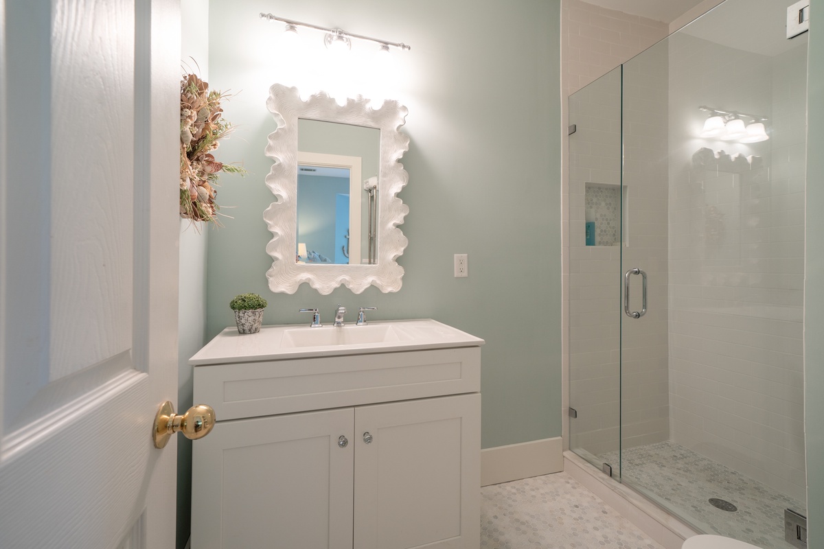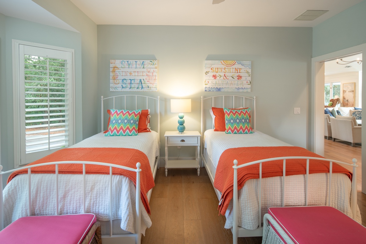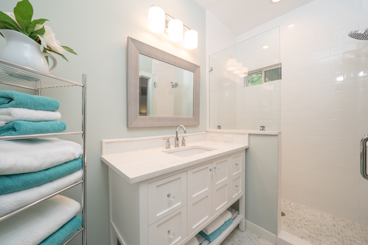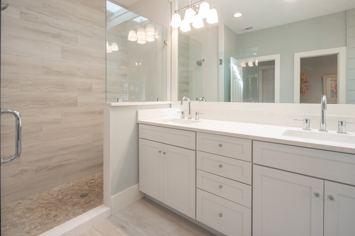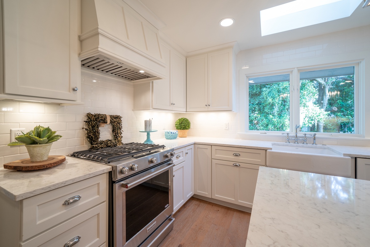 The marvelous updates found throughout the home have created a lush sense of comfort in each of the three guest rooms. In the first, we find a queen size bed enjoying lush natural light from bay windows gazing down on the front garden, illuminating a space with skylight, ceiling fan, flat-screen TV and spacious en suite with dual-basin vanity and walk-in shower. Another enjoys the same bay window view while pairing dual twin beds before a flat-screen TV, ceiling fan and en suite with single-basin vanity and walk-in shower.