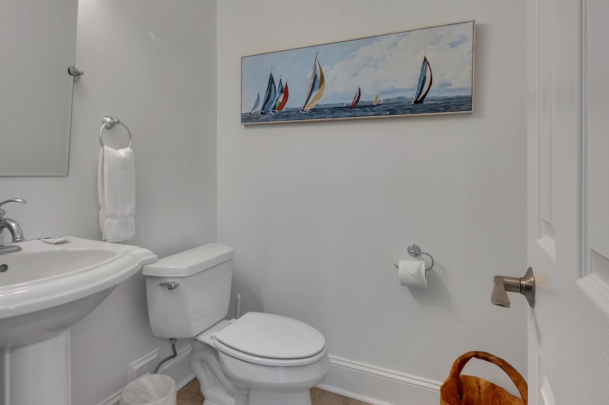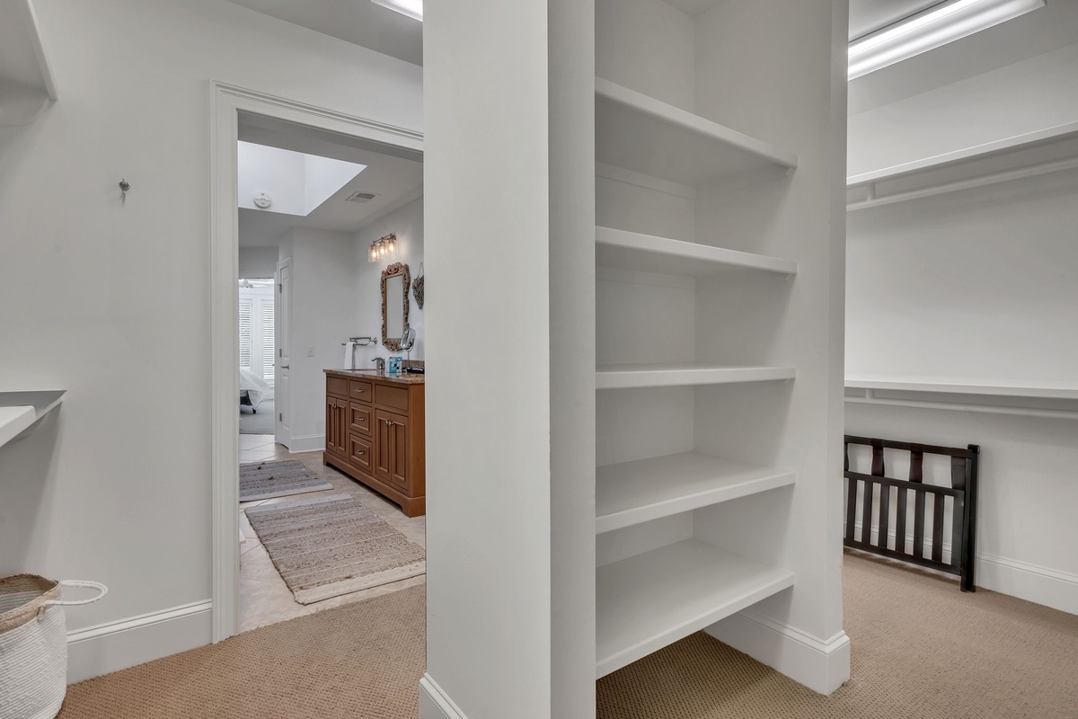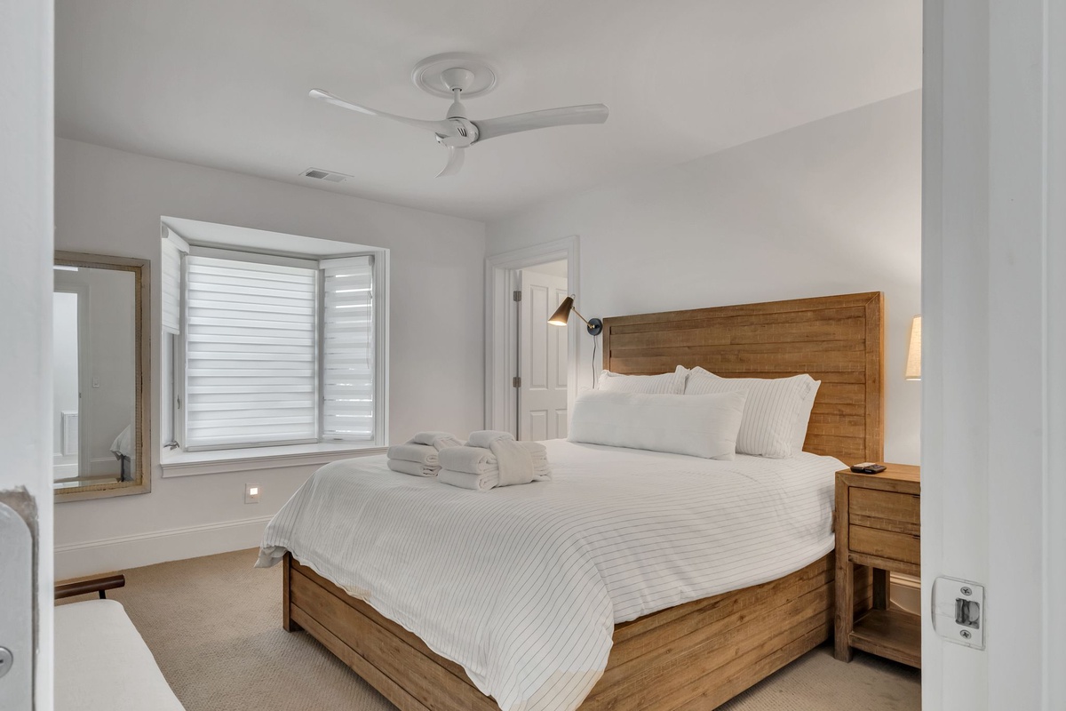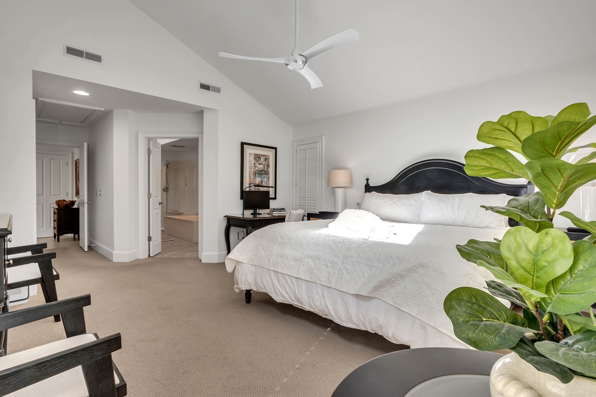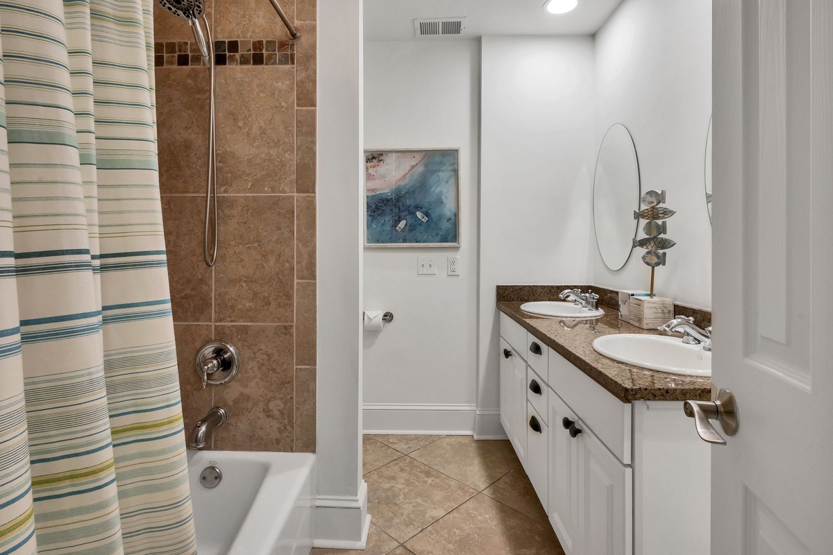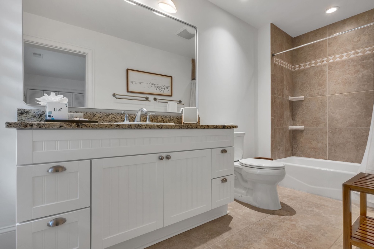 The bedrooms include a master suite with King bed, desk, TV and private bath with double vanity, separate tub, walk-in shower and large, walk-in closet. The two guest bedrooms have their own hallway on one side of the house. The first bedroom features a queen bed, window seat, TV, closet and private bath with shower/tub combination, and the second bedroom features a king bed and set of bunk beds, TV and closet. The bathroom that serves this bedroom features a double vanity and shower/tub combination.
