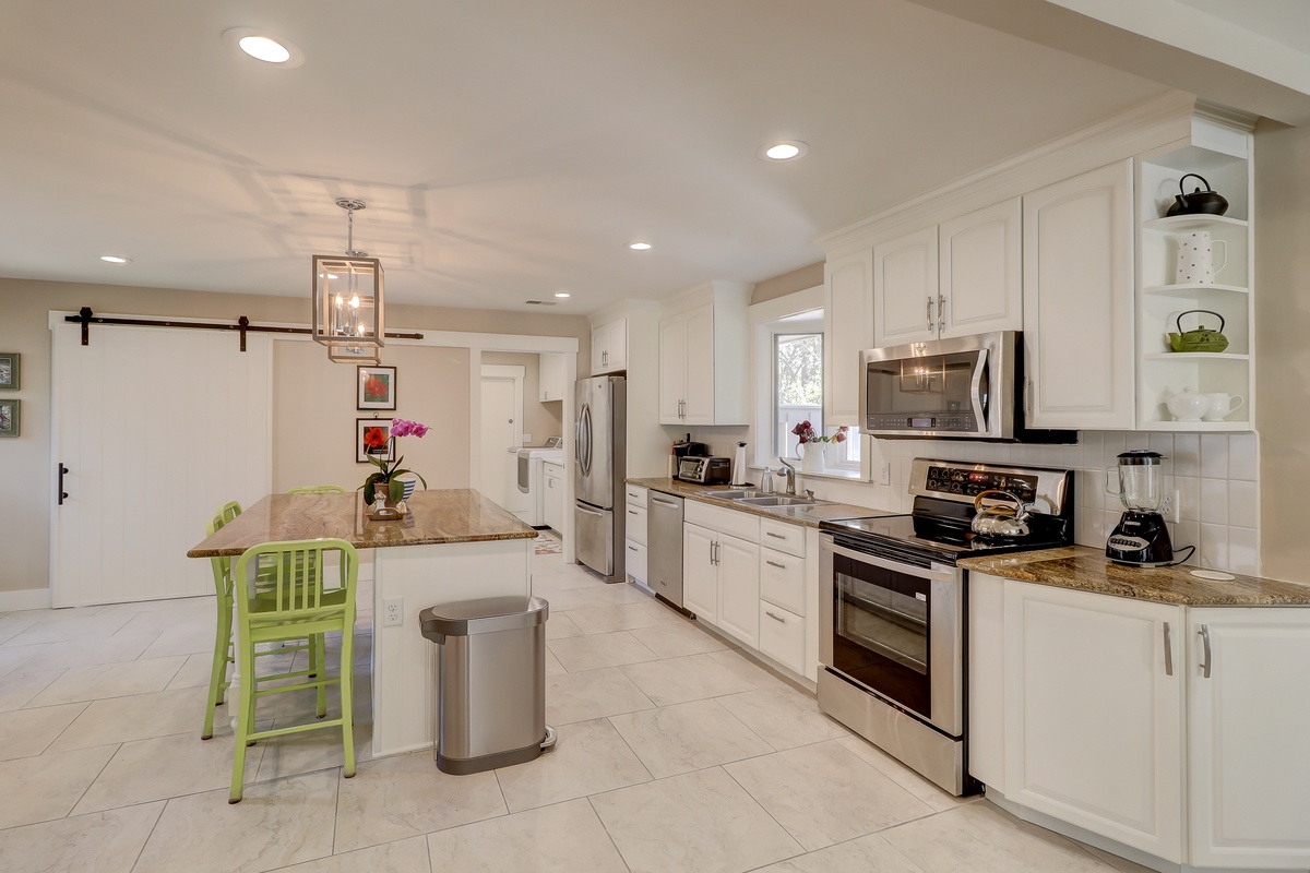 Just off to the side, another open space incorporates formal dining for six, expandable to eight, and the wonderfully appointed kitchen. Here, exquisite updates have created a gourmet dream with wide center island and full suite of stainless-steel appliances.