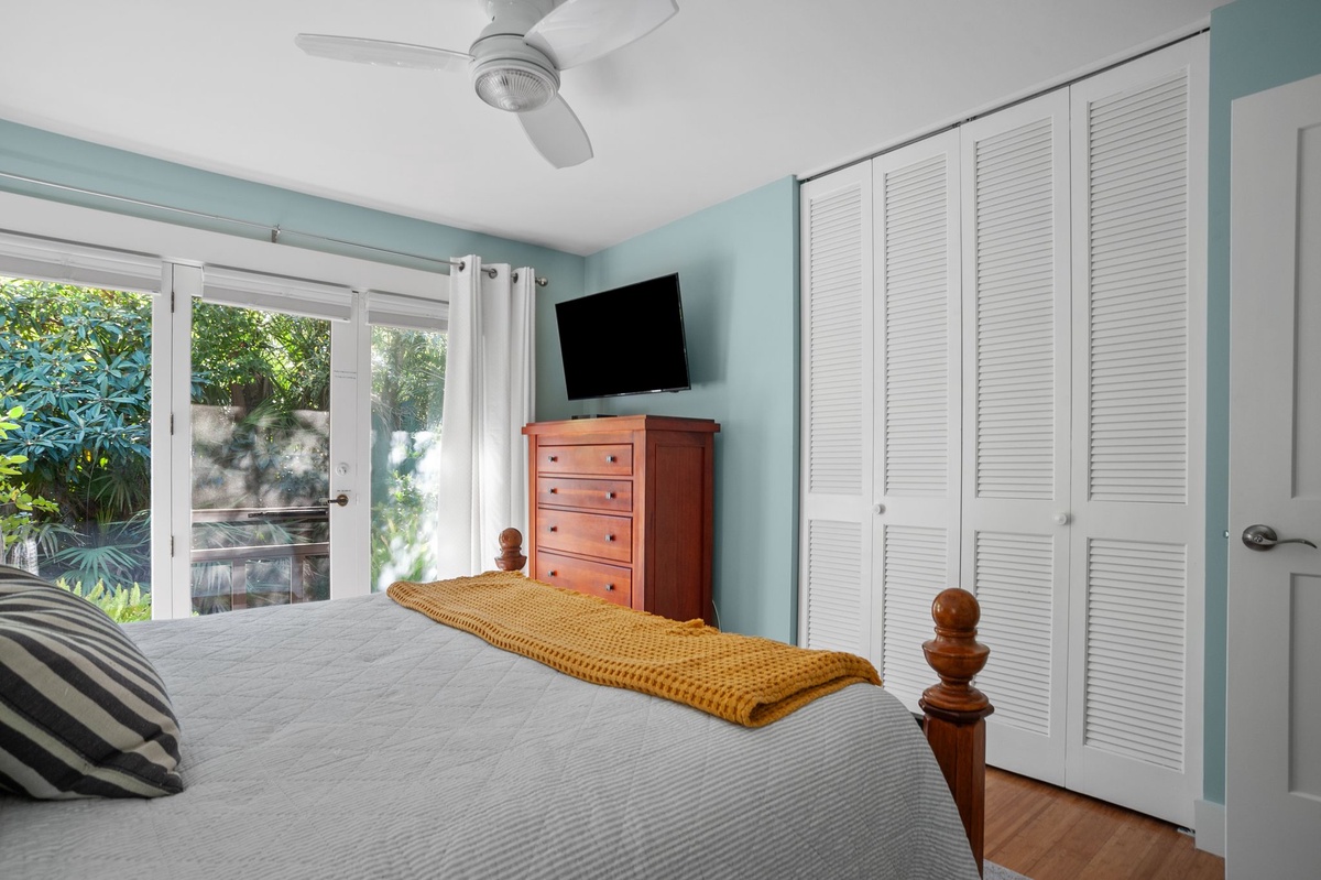 Three guestrooms to one side of the great courtyard indulge with comfort and sophistication. The first enjoys a queen-size bed, wall-mounted flat-screen TV and private access to a tranquil garden along one side of the property. The second enjoys this same garden access in a space with a sleeper sofa as well as a spacious queen bed, ceiling fan and flat-screen TV. These two rooms share access to a full bath with tub and shower set in beautiful custom tiles.