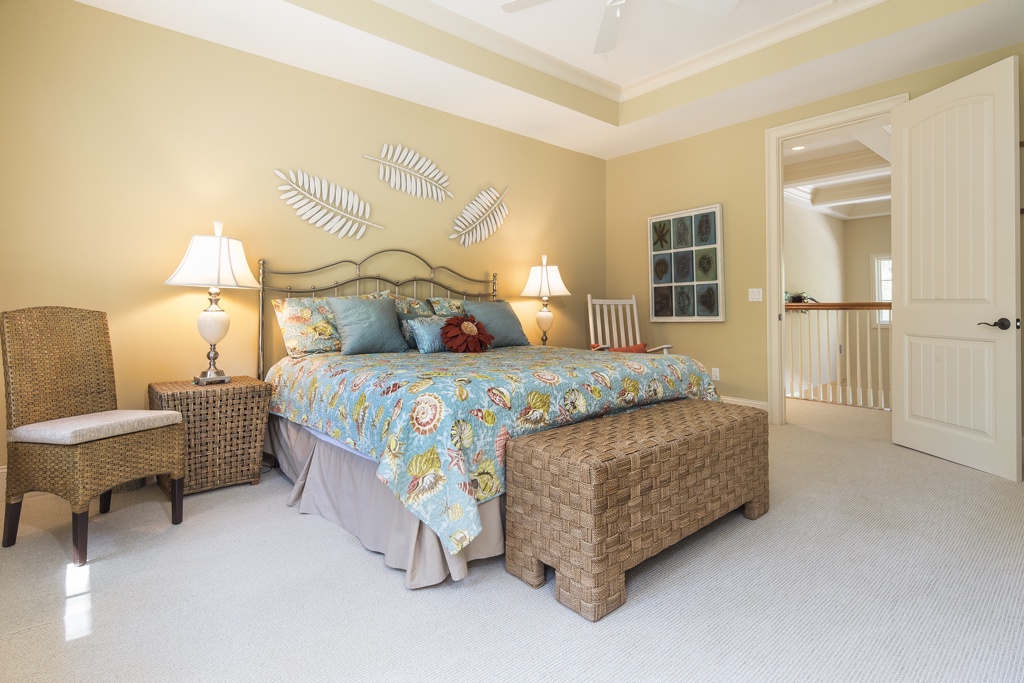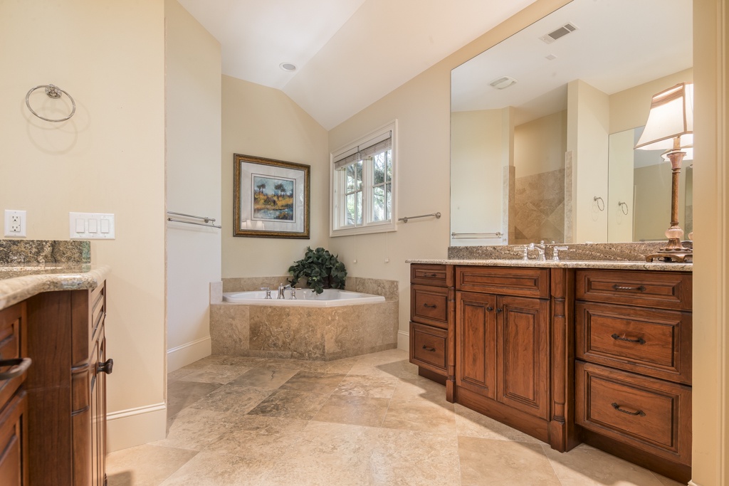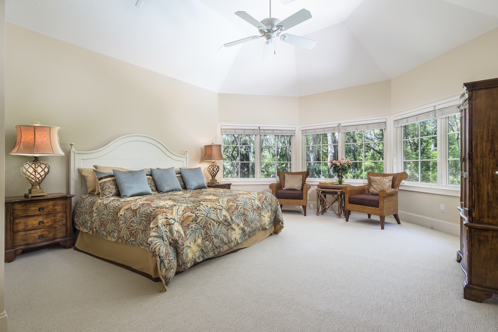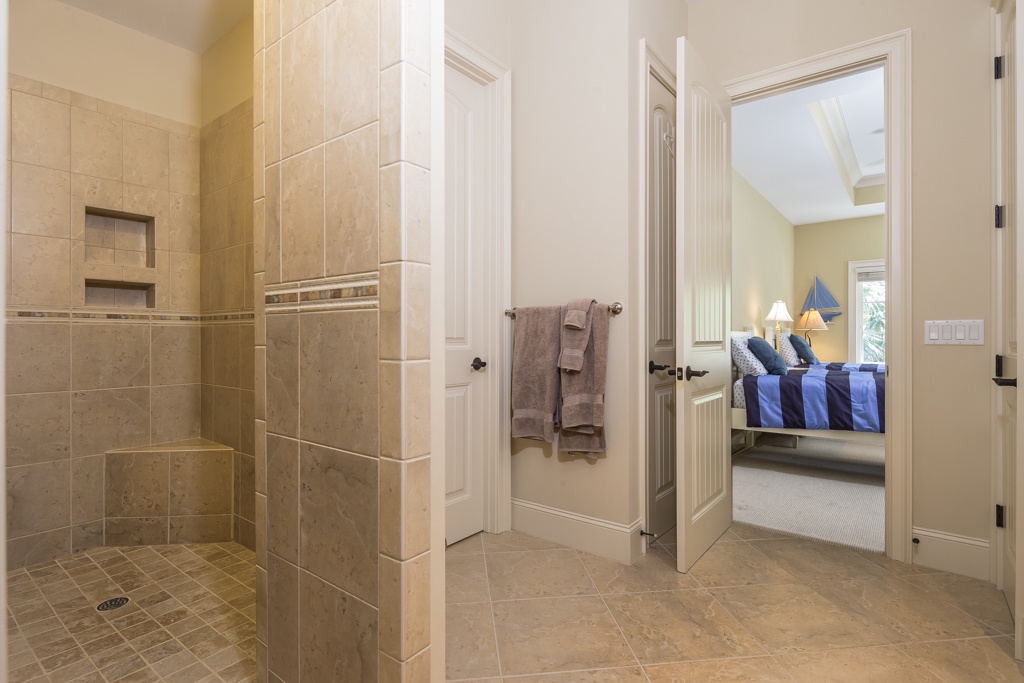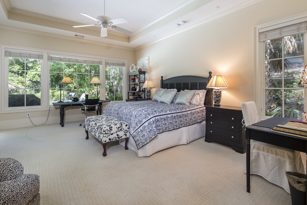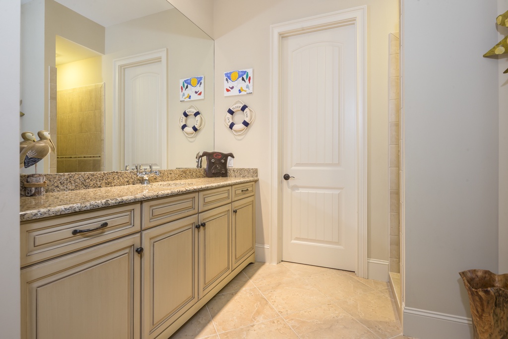 The same dedication to spaciousness and elegance can be found among the property’s six bedrooms, four of which can be found on the second story. The first we come to sees a king bed set beneath tall ceilings and before a panoramic view of the rear garden. Lushly appointed, this suite’s amenities include flat-screen TV, ceiling fan and en suite with his-and-hers vanities, soaking tub and walk-in shower. The second upstairs bedroom, just off the grand balcony overlooking the great room, enjoys a king-size bed, flat-screen TV and private en suite with tub and shower.